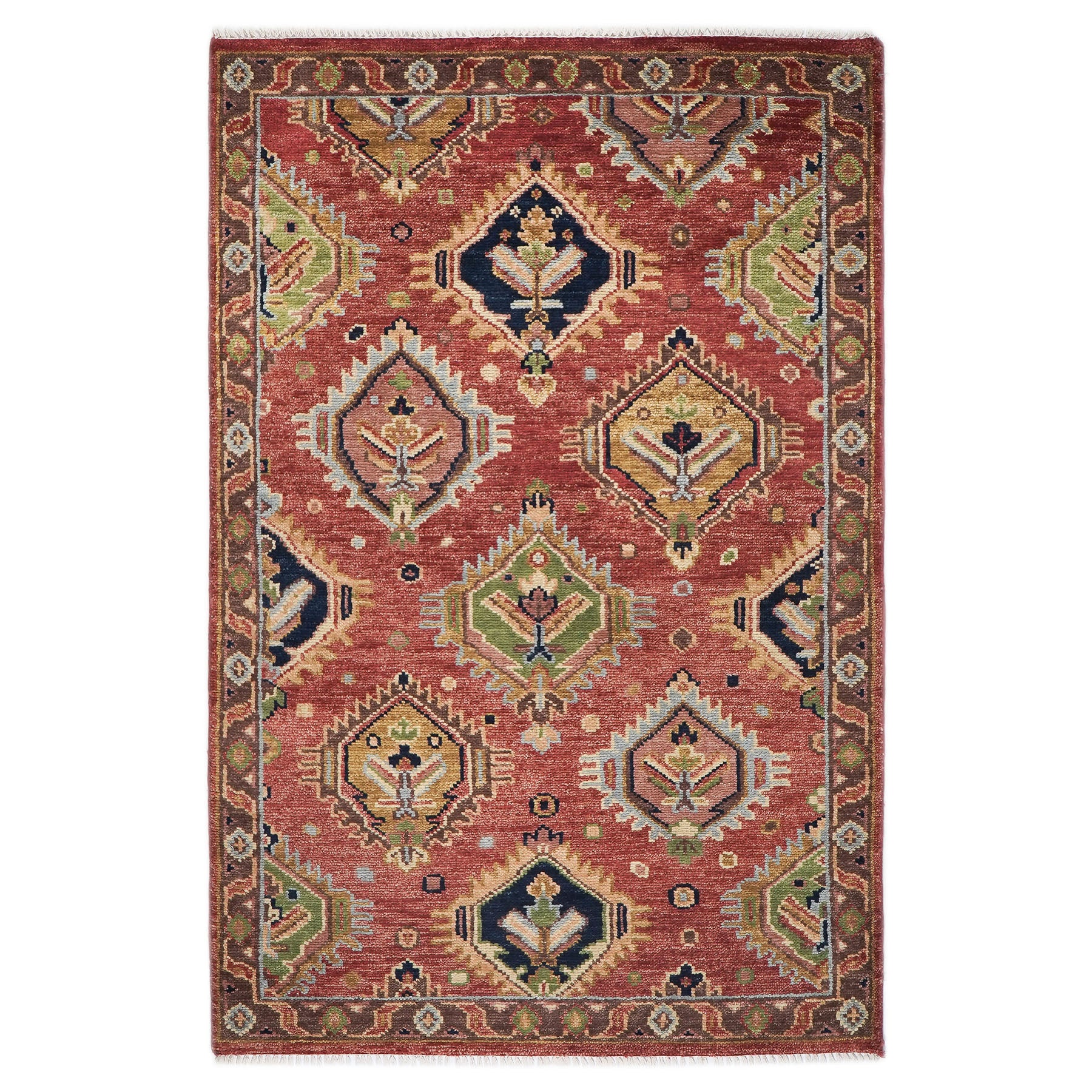A celebration of Arts & Crafts artistry, this hand-knotted wool Oushak rug radiates warmth with its distinctive rose-red field adorned with an enchanting array of geometric medallions in navy, lime, and gold. The charming composition showcases scattered hexagonal motifs, each containing stylized botanical elements that create a playful yet sophisticated visual rhythm across the luxurious wool surface, while touches of brown and peach add organic depth to the design. Premium wool has been meticulously hand-knotted on a durable cotton foundation using traditional techniques, delivering exceptional quality and the plush underfoot texture that makes authentic Oushak rugs so coveted. The warm brown border, decorated with geometric patterns in harmonious tones, provides a grounding frame for the rectangular design while enhancing the rug's multi-colored palette. The inviting combination of rose, navy, lime, and gold creates a spirited yet versatile foundation that brings character and warmth to diverse interiors, making it an ideal choice for those seeking a rug with distinctive personality and timeless craftsmanship. Bring home this Arts & Crafts treasure that merges artisanal tradition with vibrant, joyful design.