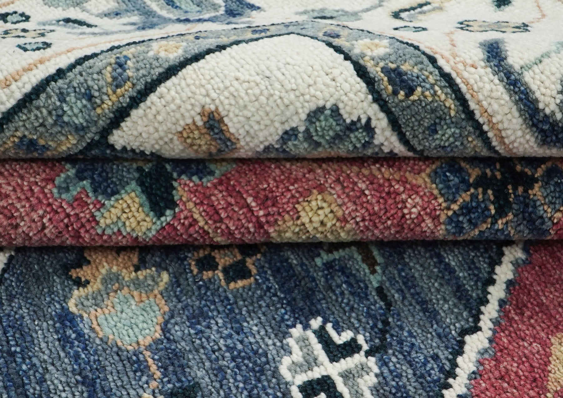 Luminous rose and sophisticated slate blue converge in this striking hand-knotted wool masterpiece that showcases the architectural beauty of traditional Oushak design through bold geometric layering and masterful color interplay. The captivating nested diamond medallion system creates mesmerizing depth, with a central brown diamond radiating outward through successive zones of slate blue and rose, each field adorned with delicate floral motifs and geometric accents that demonstrate the weaver's extraordinary attention to detail. Framed by a generous ivory border alive with graceful scrolling motifs in navy and gold, the composition achieves a perfect equilibrium between the dramatic interior geometry and the refined classical surround, allowing each element to shine while contributing to the cohesive whole. Hand-knotted by master artisans using premium wool on a cotton foundation, this piece represents traditional rug-making at its finest, delivering not only the plush texture and exceptional durability expected of superior craftsmanship but also the authentic variations and subtle irregularities that distinguish genuine handwork from mechanical production. The distinctive palette of rose, slate, ivory, and celadon creates a foundation of unexpected elegance and versatility, bringing warmth, cultural depth, and sophistication to any interior while offering the kind of visual complexity that reveals new details with each viewing.