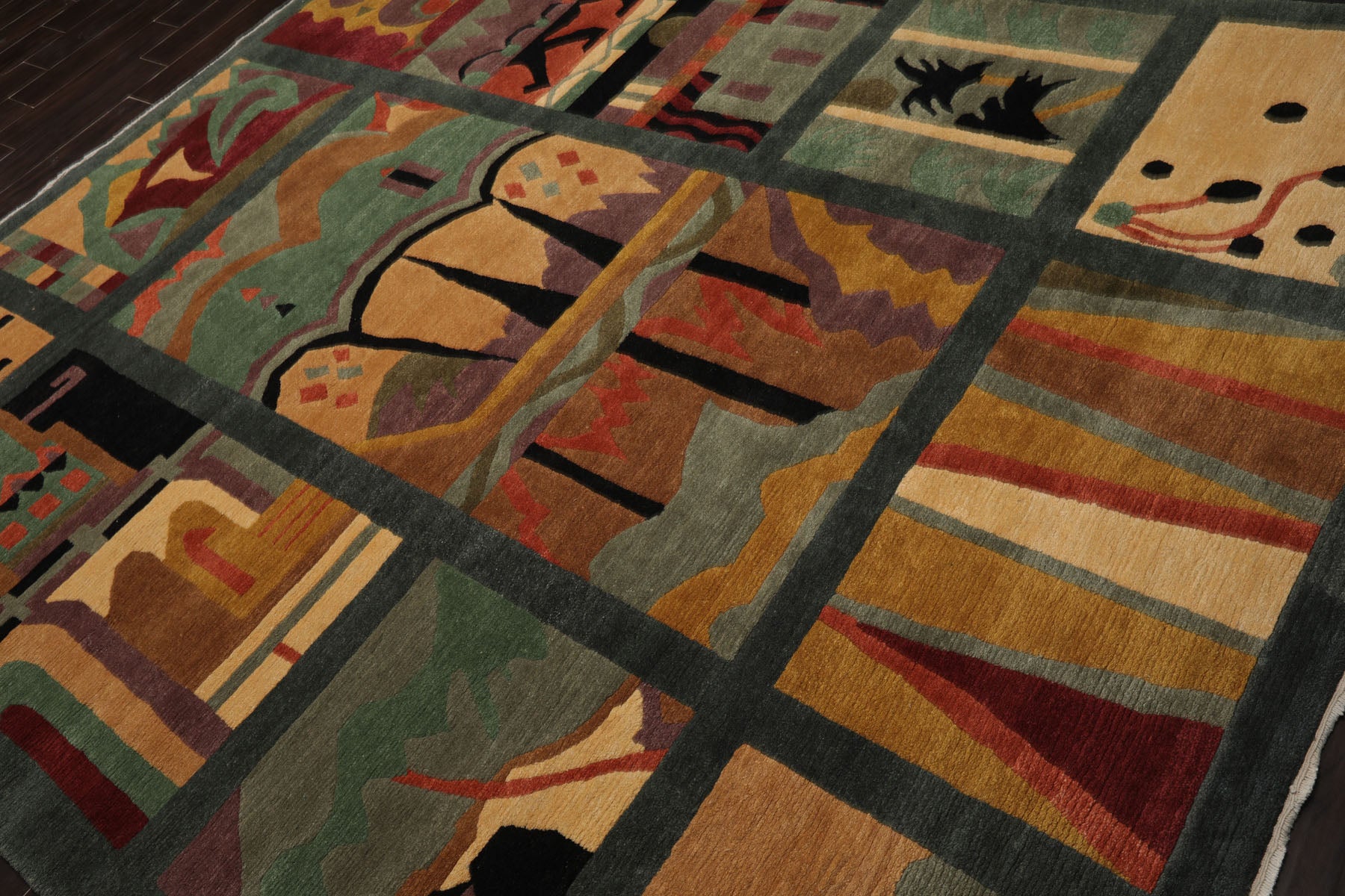 Hand-knotted in Nepal this Tufenkian Tibetan rug features a plush 0.75" pile and a Swiss wash finish for added softness and sheen. The “Deco Panel Spruce” design is an Arts & Crafts-inspired composition divided into geometric panels each depicting stylized landscapes and abstract motifs. The palette blends teal peach gold salmon rust black aubergine and multi-tone accents creating a striking visual narrative. Expertly crafted from fine materials this piece combines bold artistic expression with Tufenkian’s renowned quality making it a unique statement for both modern and eclectic interiors.