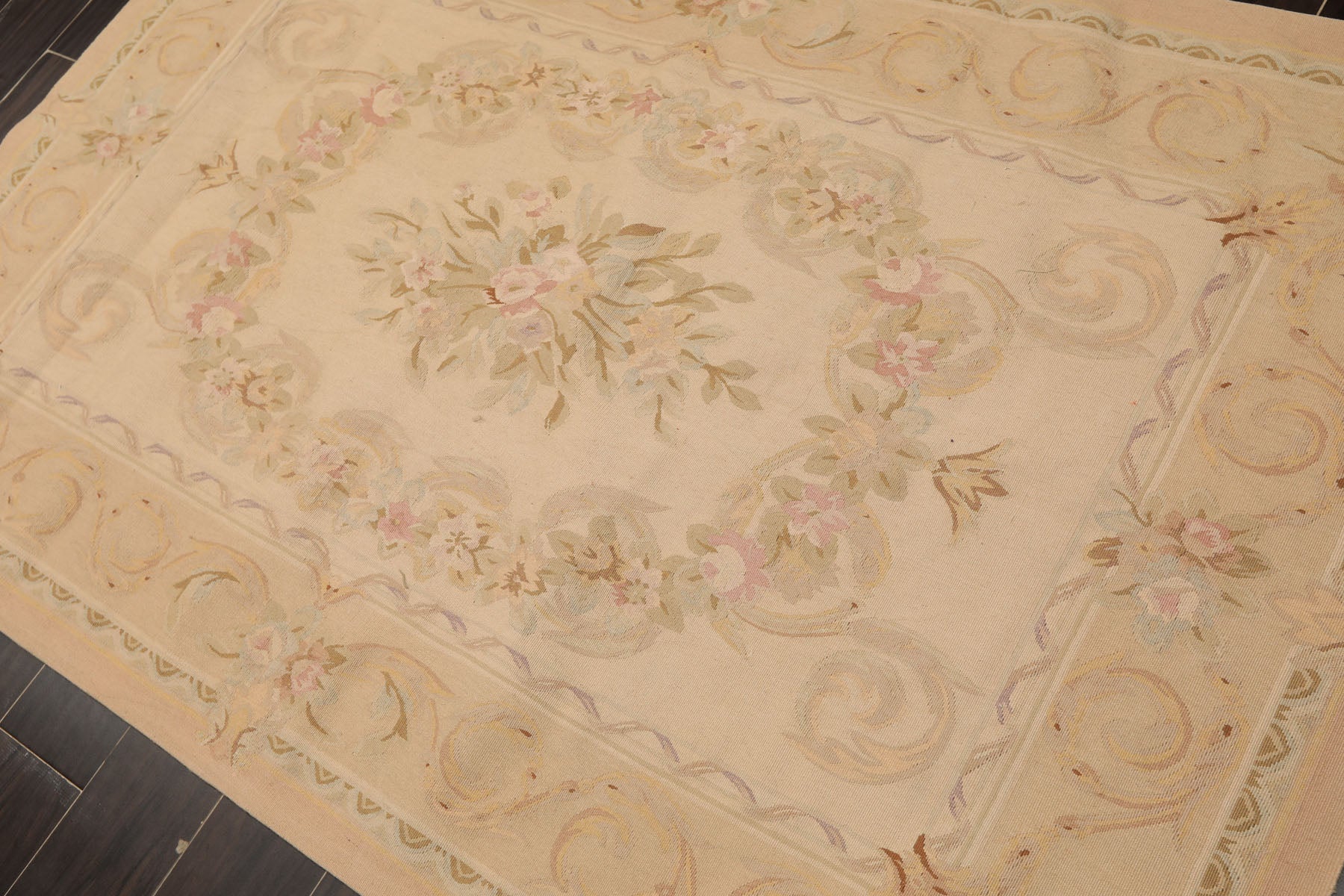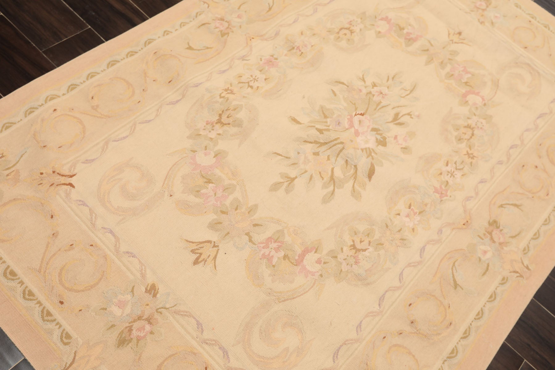 A softly layered 4' x 6' hand woven wool French Aubusson rug, this traditional floral piece is designed to bring refinement and visual ease into a space, with its flat 0.10" cut pile and cotton foundation lending the surface a smooth, composed feel. The pale beige field is thoughtfully arranged around an oval floral centerpiece, framed by flowing garlands and a finely detailed border that introduce structure without heaviness. Muted earth tones of tan, taupe, sage, blush, and gentle hints of peach are blended to create a palette that feels warm and settled while remaining adaptable to a wide range of interiors. The florals appear softly aged and lightly drawn, allowing the pattern to create a sense of calm and continuity. This measured balance of ornament and openness makes the rug especially effective at softening hard surfaces, visually grounding furniture, and bringing cohesion to your space. Thoughtful and understated, it offers a lived-in elegance that supports everyday living while quietly elevating the atmosphere around it.