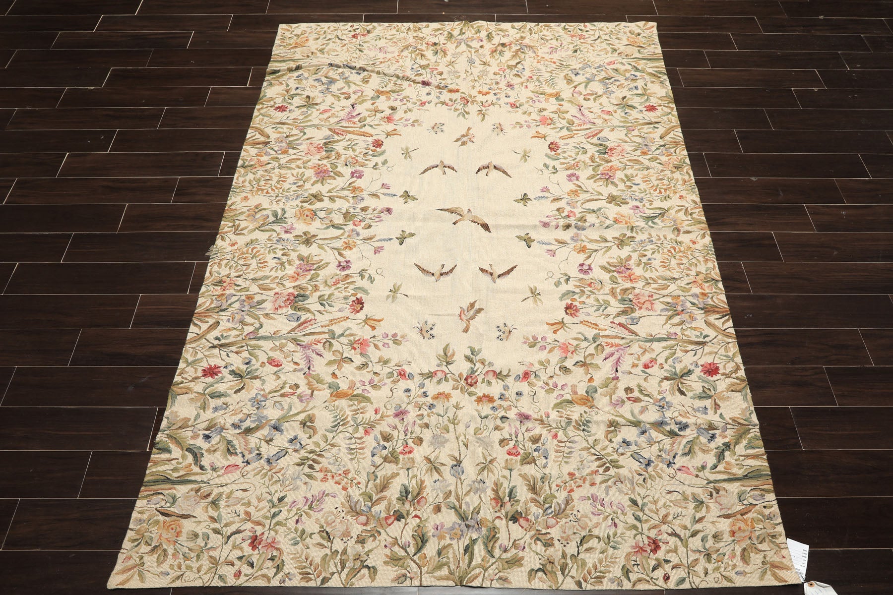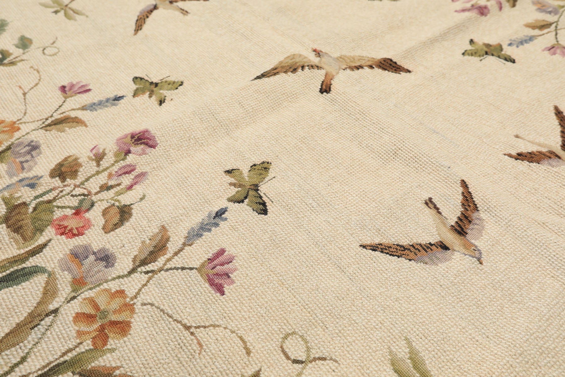 A truly distinctive 5' x 8' hand woven wool French needlepoint rug, this traditional pictorial piece stands apart for its narrative quality and fine, illustrative detail, presented through a flat 0.10" cut pile on a cotton foundation. Set on a soft beige ground, the design opens into a gently cleared central field where delicately rendered birds appear in motion, surrounded by an expansive tapestry of flowering vines, leaves, and blossoms that grow inward from the edges. The palette is layered with sage and green tones, softened by lavender, pink, blue, and warm brown, and feels nuanced and natural, allowing the scene to unfold gradually. Unlike strictly patterned rugs, this composition reads almost like a painted landscape, with variation, asymmetry, and subtle pauses that invite closer looking. The needlepoint technique gives remarkable precision to each bird, petal, and stem, creating depth without heaviness and movement without clutter. Visually gentle and richly detailed, this rug brings a sense of story, calm, and individuality to a space, offering something expressive that feels both decorative and deeply considered.