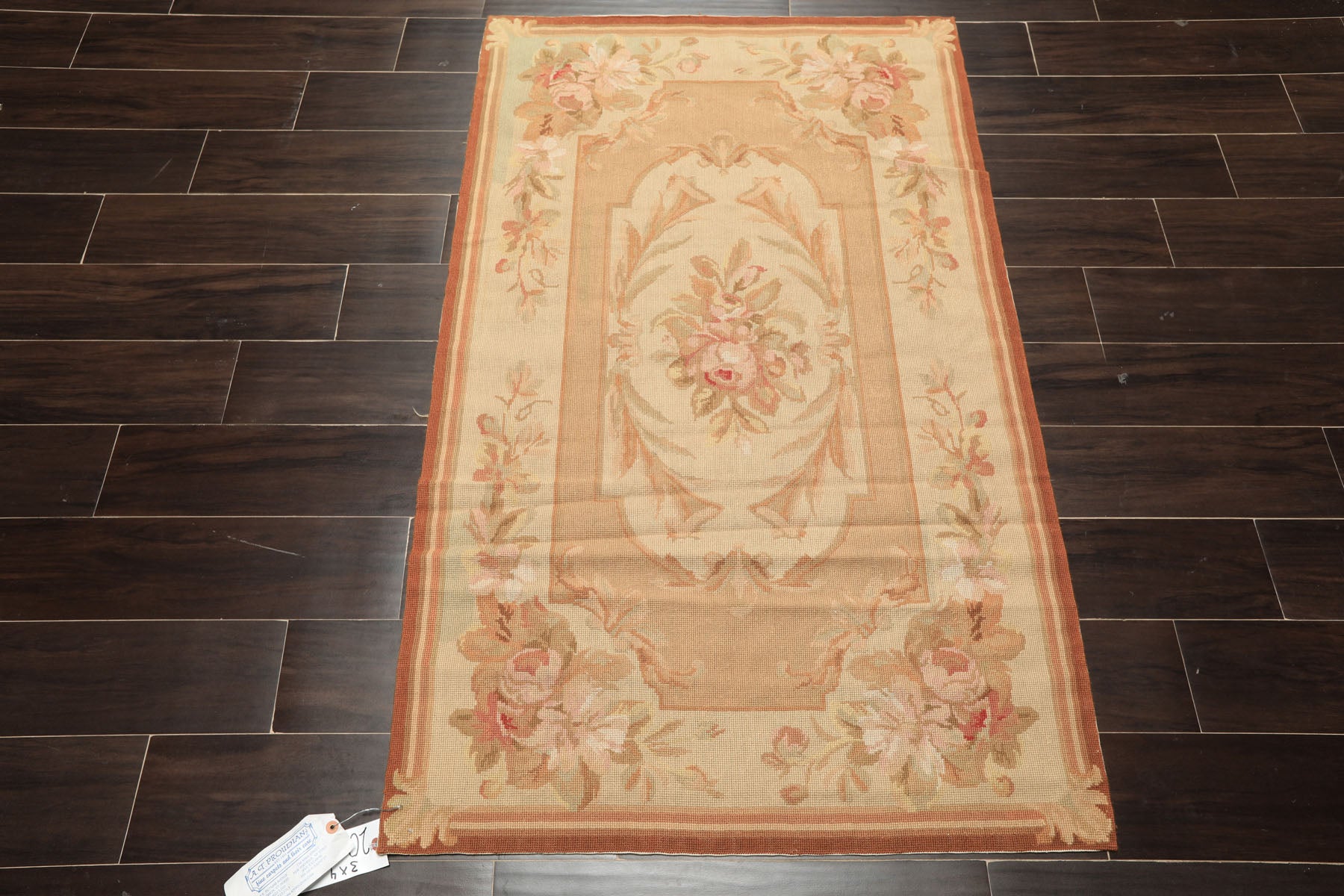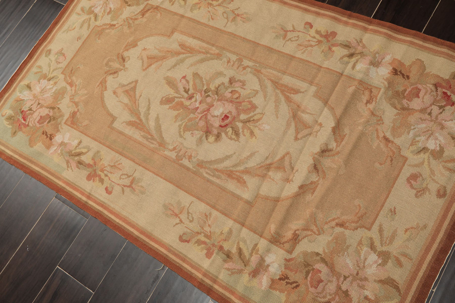 Transform your space with this exquisite hand-woven French needlepoint rug that embodies timeless European elegance. Measuring 3x4 feet, this traditional masterpiece showcases the refined artistry of French textile craftsmanship. Featuring a classical floral medallion design, this rug presents a stunning central bouquet of roses surrounded by graceful ribbons and delicate floral garlands at each corner. The symmetrical composition creates a sophisticated focal point that enhances any room's ambiance. The muted earth tone palette, featuring soft beiges, warm tans, gentle rose accents, and subtle browns, offers versatile styling options that complement both traditional and transitional interiors. The compact 3x5 size makes this rug ideal for entryways, beside beds, in front of fireplaces, under accent chairs, or as a layering piece in larger spaces, and Its neutral color palette ensures seamless integration with existing décor. Bring a touch of French sophistication and artisanal quality to your home with this captivating needlepoint rug.