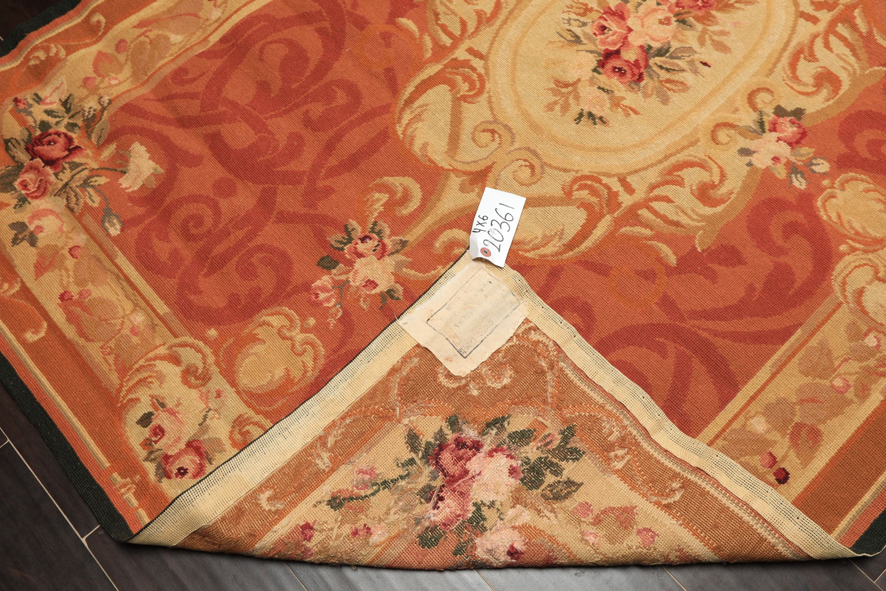 The composition of this 4x6 French needlepoint rug is built around a carefully proportioned central medallion, framed by with floral groupings that are evenly distributed across the field and borders. The gold and red ground provides a rich foundation, while layers of rose, caramel, beige, pink, and touches of green add dimension to the surface of the rug. The flat, low cut pile keeps the pattern crisp and readable, allowing the needlepoint technique to show its strength in the clarity of outlines and the smooth transitions between colors. Every element feels intentionally placed, from the balanced symmetry of the medallion to the way the border motifs echo the forms within the field, creating a sense of continuity across the rug. Hand woven from wool on a cotton foundation, the rug combines durability with a refined surface quality that holds its structure over time. What makes this piece especially compelling is its ability to carry decorative detail offering presence, warmth, and classical structure in equal measure. As a result, it becomes a foundational piece that anchors a space through design integrity and craftsmanship, and continues to reward attention through its balanced patterning and enduring appeal.