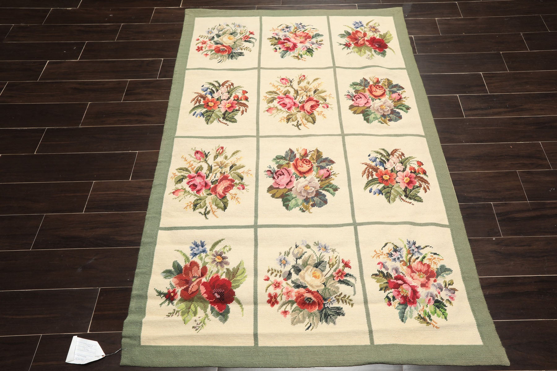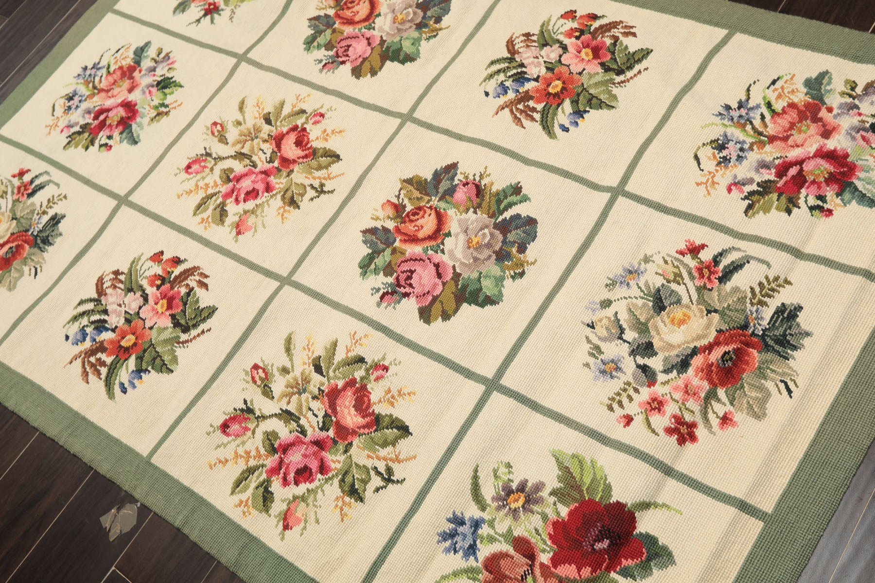 A charming 4' x 6' hand woven wool Portuguese needlepoint rug, this traditional floral panel design brings a distinctly decorative and inviting feel through its flat 0.10" cut pile, cotton foundation, and soft ivory ground framed by sage green borders. The surface is arranged in a classic grid of floral vignettes, each panel showcasing its own bouquet rendered in warm reds, pinks, golds, and gentle greens, giving the rug a sense of rhythm, variety and visual cohesion. The needlepoint technique allows for crisp outlines and painterly detail, making the flowers feel lively and expressive. Its balanced palette and orderly panel layout give it an easy elegance that works well in spaces where pattern and color can shine without overwhelming the space. Thoughtfully composed and full of character, this rug feels decorative, cheerful, and rooted in traditional European needlepoint design.