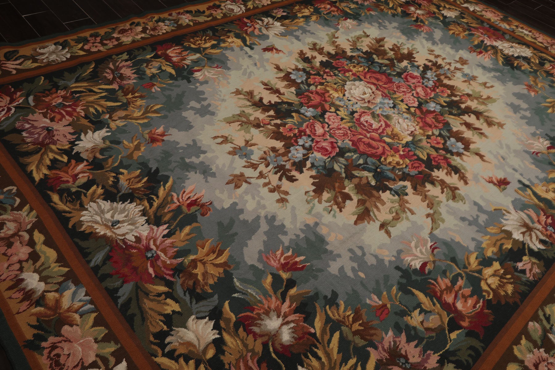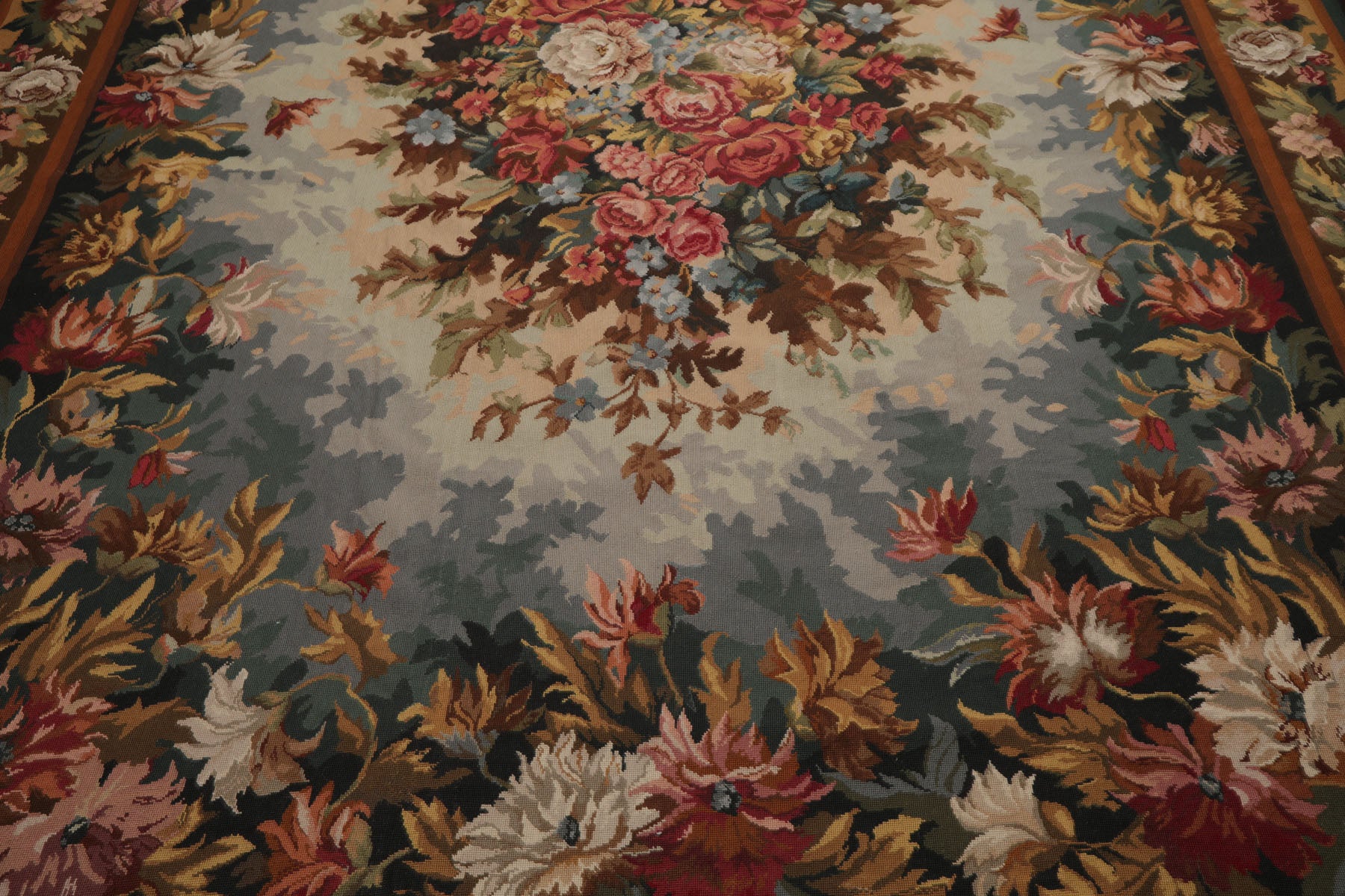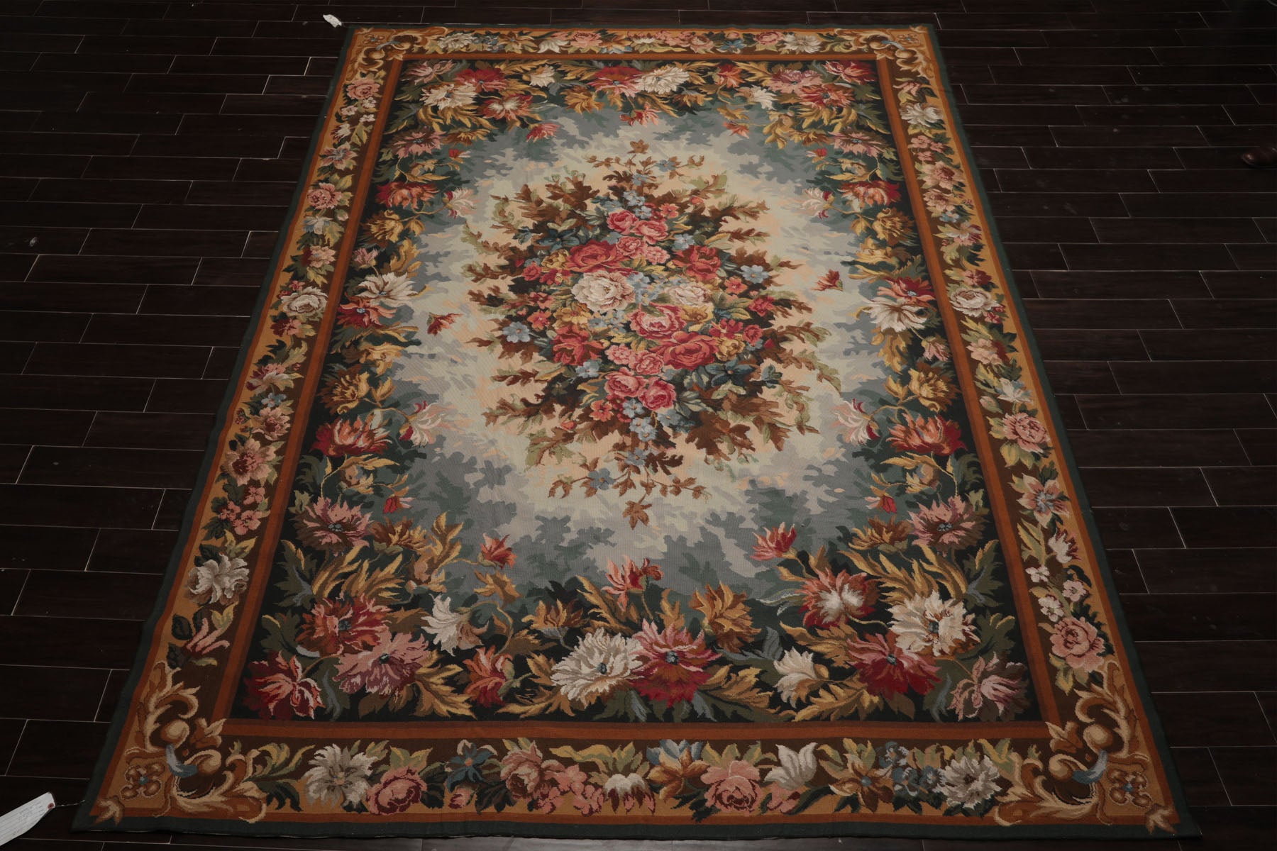 Handwoven in the French needlepoint tradition this exquisite rug captures the elegance of European floral artistry with remarkable precision. Crafted in China with a flat 0.1-inch pile the piece is made by the Asmara company known for preserving old-world needlepoint techniques in high-quality rugs using a fine flatweave construction that resembles the texture of a classic tapestry while retaining the durability of a functional floor covering. At the center a lush bouquet of roses and garden blooms bursts in shades of burgundy rose pink and ivory framed by layers of leafy foliage in teal aqua sage gold and brown. The detailed border enhances the overall composition lending the piece a sense of harmony and old-world charm. Its soft color transitions and intricate floral motifs create a serene yet refined atmosphere whether placed in a living room under a vintage dining table or in an elegant entryway. The refined craftsmanship and timeless palette make it a versatile heirloom-quality piece that brings character and grace to any setting.