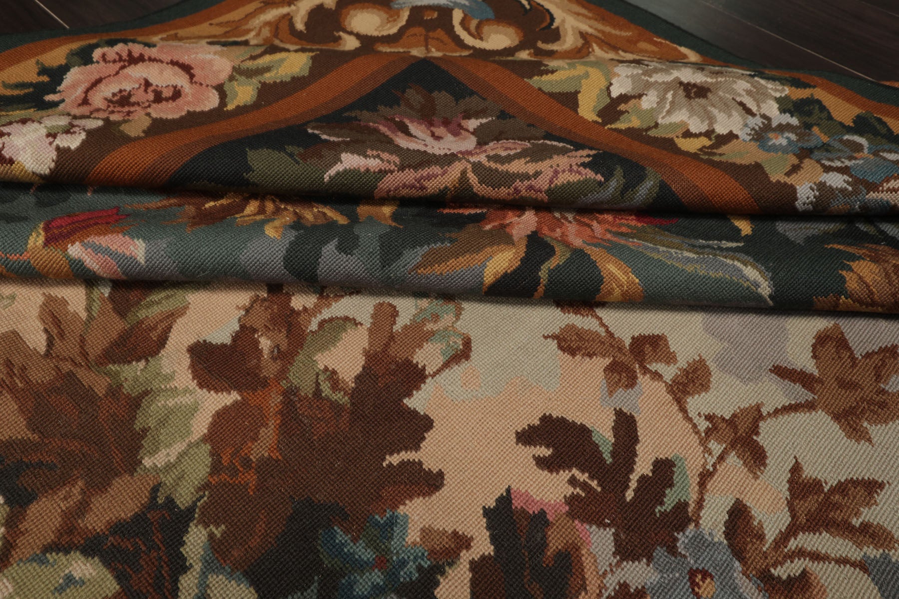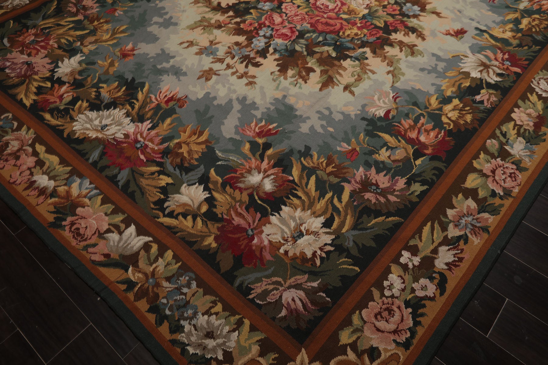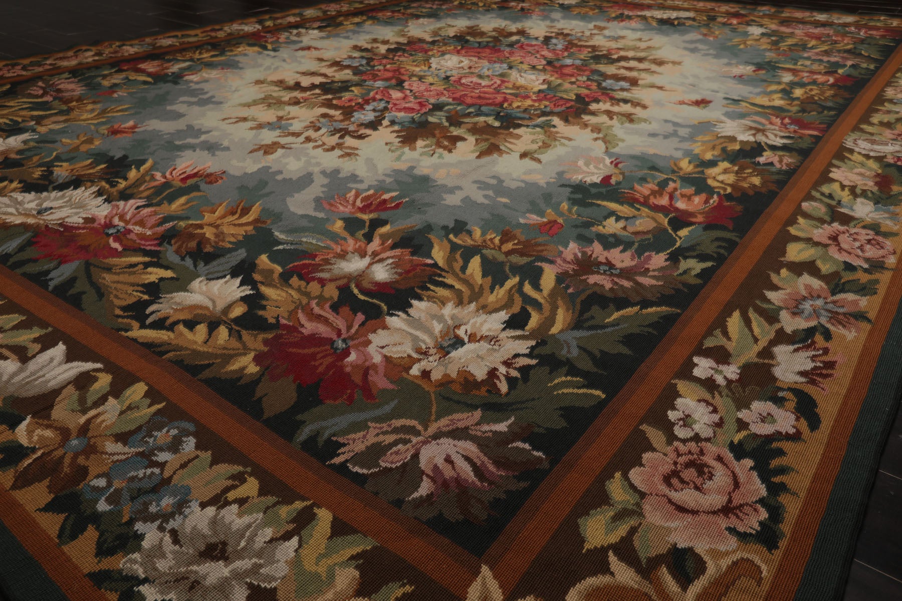 Handwoven in the French needlepoint tradition this exquisite rug captures the elegance of European floral artistry with remarkable precision. Crafted in China with a flat 0.1-inch pile the piece is made by the Asmara company known for preserving old-world needlepoint techniques in high-quality rugs using a fine flatweave construction that resembles the texture of a classic tapestry while retaining the durability of a functional floor covering. At the center a lush bouquet of roses and garden blooms bursts in shades of burgundy rose pink and ivory framed by layers of leafy foliage in teal aqua sage gold and brown. The detailed border enhances the overall composition lending the piece a sense of harmony and old-world charm. Its soft color transitions and intricate floral motifs create a serene yet refined atmosphere whether placed in a living room under a vintage dining table or in an elegant entryway. The refined craftsmanship and timeless palette make it a versatile heirloom-quality piece that brings character and grace to any setting.