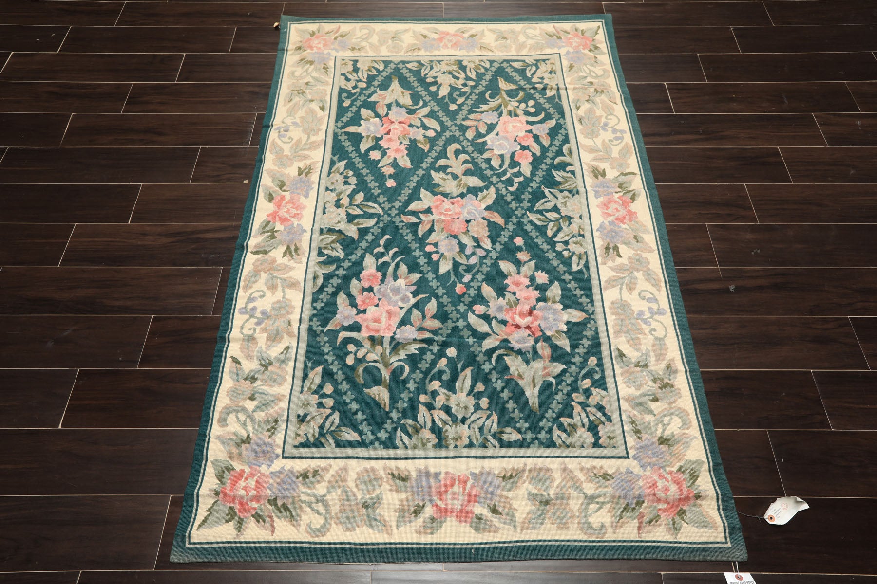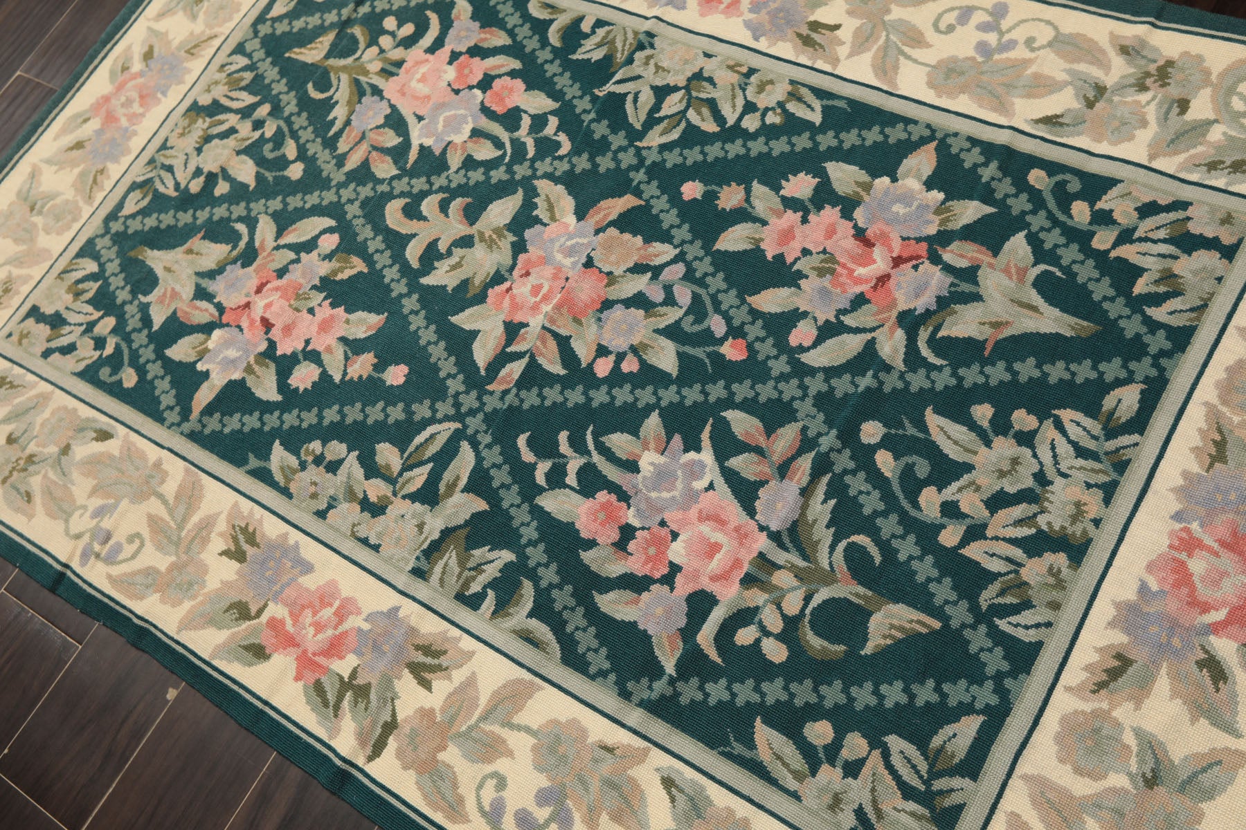 Before you is a 4x6 hand-woven French needlepoint rug crafted from wool on a cotton foundation, featuring a flat, low cut pile that gives the surface a clear, textile-like finish. The rug’s design centers on a teal field organized into a repeating diamond lattice, each section holding carefully rendered floral bouquets in shades of blush, ivory, sage, and soft blue. These florals sit comfortably within the geometry, creating a steady visual rhythm that feels structured without becoming rigid. A pale beige border frames the composition and echoes the interior motifs, bringing continuity to the overall layout. What makes this rug distinctive is how naturally its detail unfolds; the needlepoint technique allows clean outlines and smooth color transitions, while the wool pile adds warmth and durability without obscuring the pattern. Balanced, composed, and thoughtfully executed, this rug rewards attention through its craftsmanship and proportion, offering a design that remains engaging long after the first glance.
