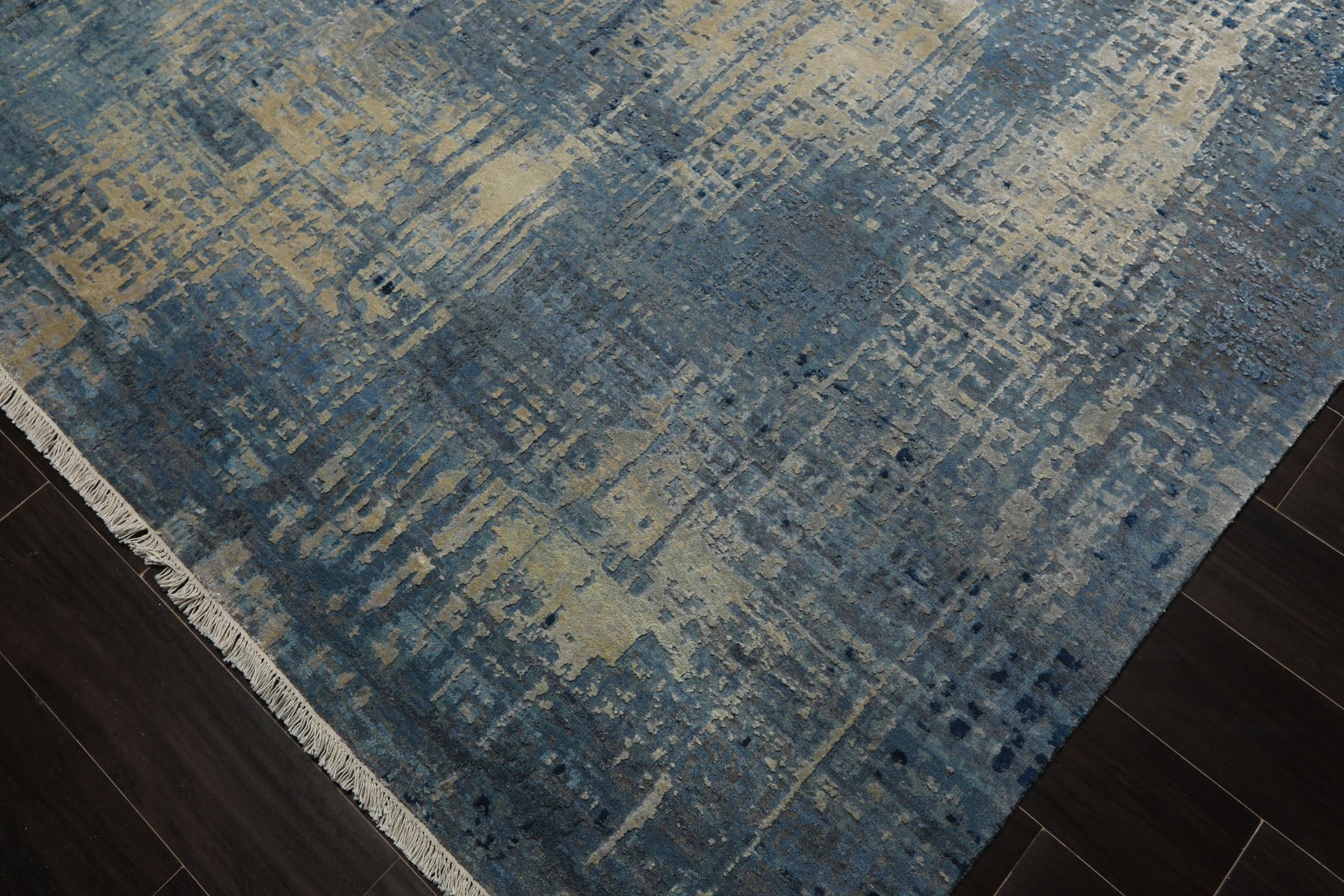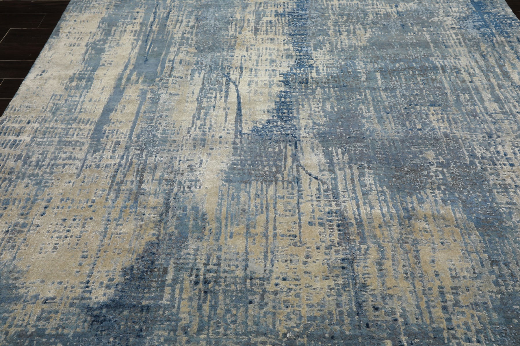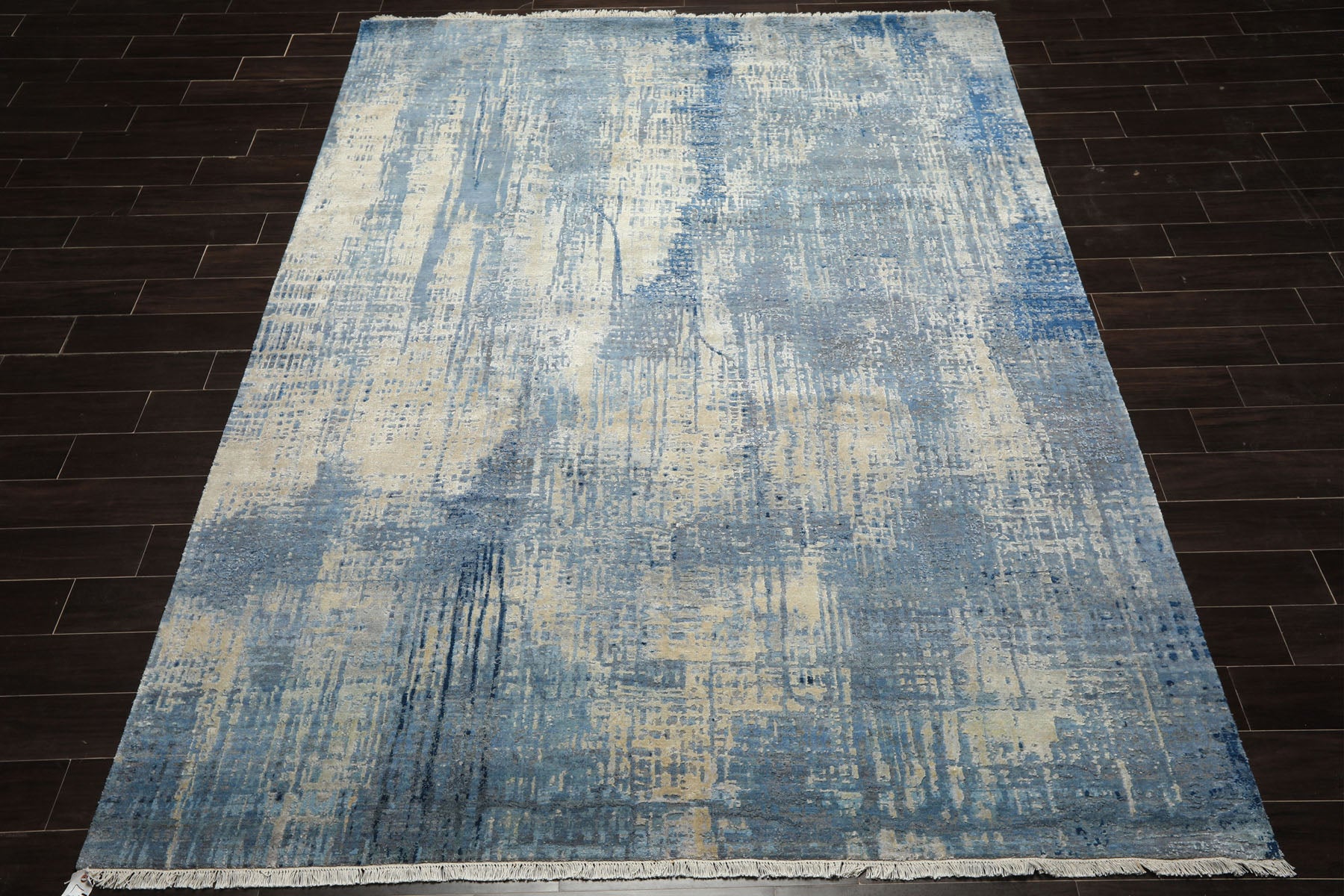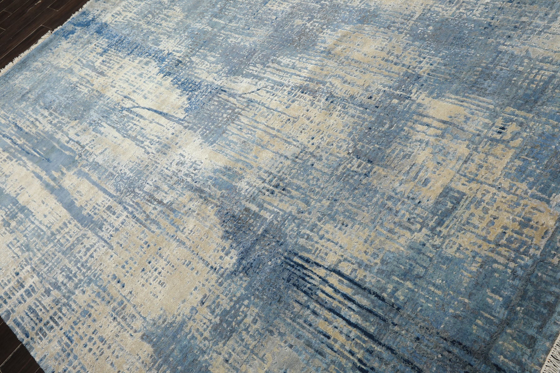 A serene blend of Sherpa-soft wool and shimmering silk creates a luxurious, painterly surface in this hand-knotted 8x10 modern masterpiece. Light beige tones merge gracefully with layered blue shades—from misty sky blue to deeper indigo—forming an abstract, atmospheric pattern reminiscent of soft rainfall, brushed textures, and contemporary art. Expert artisans hand-knot each section, producing a dense, durable foundation with high-low pile variations that enhance movement and depth. The wool brings a plush, velvety feel underfoot, while the silk adds a gentle sheen that shifts beautifully with the light. Close-up texture reveals intricate detailing, subtle tonal shifts, and intentional overlaps that give the rug its rich dimensional character. Perfect for modern, coastal, Scandinavian, and transitional interiors, the rug brightens any space while maintaining an elegant, upscale look. Its soothing palette pairs effortlessly with neutral furniture, light woods, indoor plants, and airy, nature-inspired décor.
