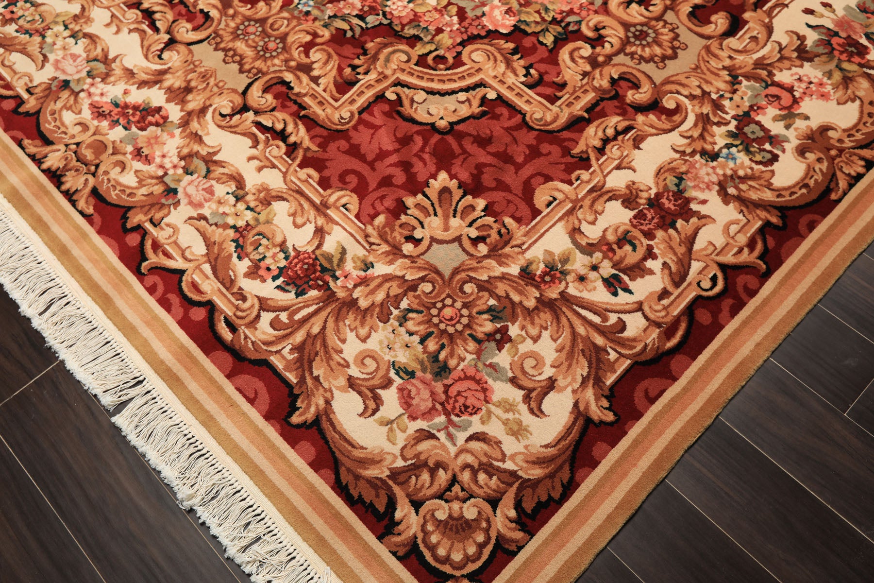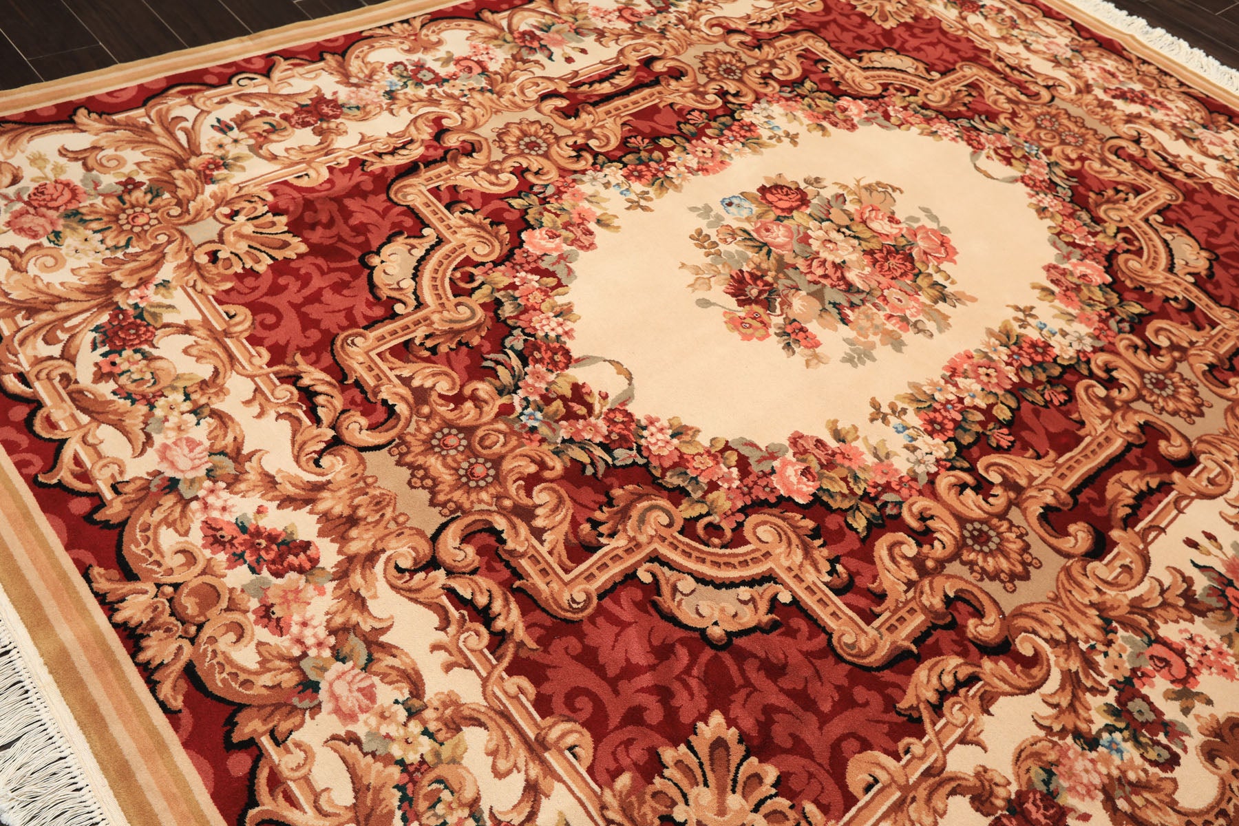 Story Behind the Art: The Savonnerie rugs have their origins in French pile floor coverings that were produced at the Savonnerie Manufactory, most prestigious factory of knotted pile rugs, that enjoyed its greatest period during 1650-1685. Today the name Savonnerie depicts the tradition of knotted pile Savonnerie rugs with their unique design and color schemata of essentially French designs, pictorial or armorial framed medallions, densely massed flowers in bouquets or leafy rinceaux against deep blue, black or deep brown grounds, within multiple borders. Further what distinguishes French Aubusson Savonnerie rugs is the technique of depth perspective that was invented by 17th century French artists and weavers whereby the patterns in the rug seem three dimensional. As such, Aubusson Rugs exhibit complex color patterns, symmetrical knots and flamboyant designs. Today, it is still possible to enjoy these rugs as they continue to be replicated in India, Pakistan, China.