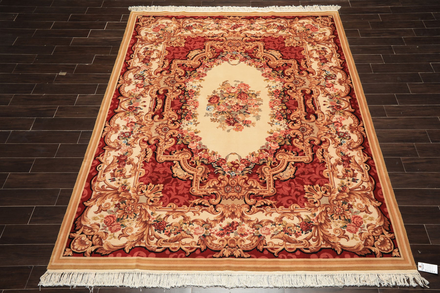 Celebrating the elegance of 18th-century French decorative arts, this 8'1" x 10' hand-knotted Aubusson Savonnerie rug exemplifies precision and poise in textile design. Woven from fine wool at a remarkable 300 KPSI density, it features a low 0.30-inch cut pile on a durable cotton foundation. The rug’s ivory field is framed by baroque-style scrollwork and floral garlands in blush, rose, tan, and mint tones, paying homage to classical French interiors that favored symmetry and soft contrast. Perfect for formal living rooms, parlors, or refined bedrooms, it lends a sense of compositional balance and quiet grandeur. The fine knotting enhances the clarity of each botanical detail, while the muted pastel palette ensures versatility within both antique and contemporary spaces.
