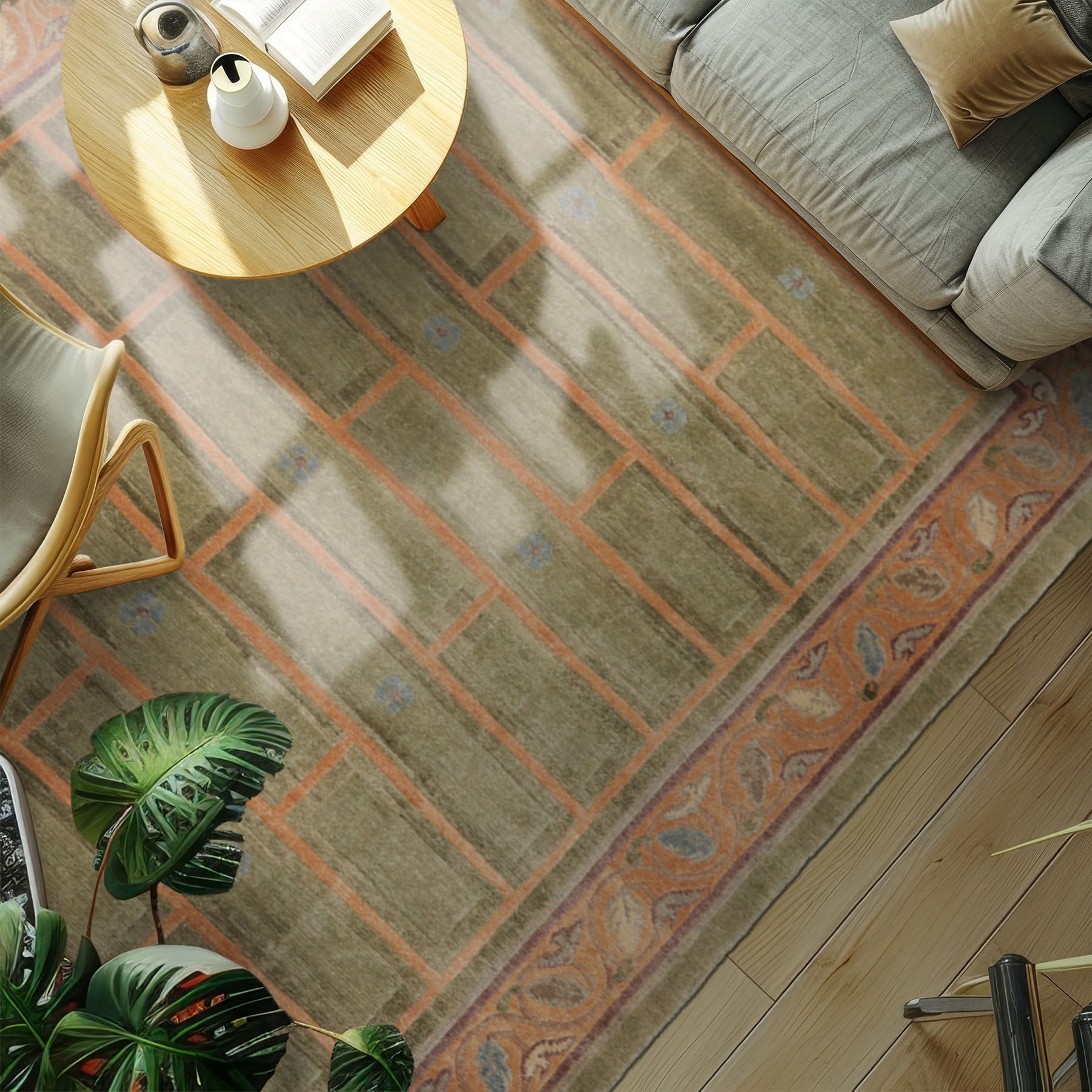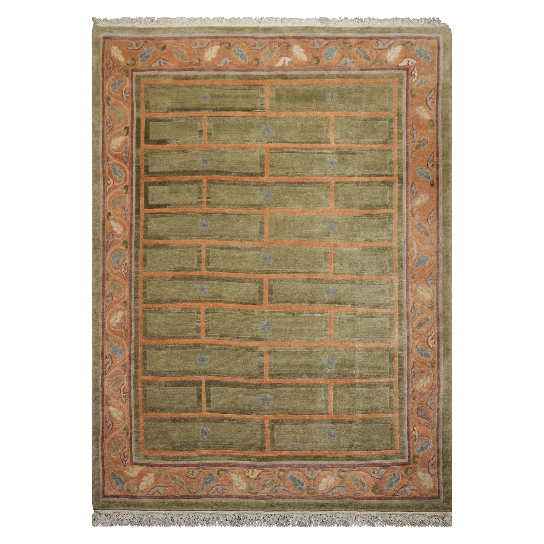Before you is a stunning hand-knotted Tibetan rug from Nepal by Mikhaelian & Kohlberg that features a distinctive brick wall pattern encompassed by elegant multi band borders. Rendered in an Arts & Crafts style the design showcases interlocking rectangular motifs in a harmonious palette of Mint Peach Aubergine Gray Blue and subtle multi-colored accents creating a contemporary yet timeless visual rhythm. Finished with the signature Swiss wash technique the rug’s colors are gently softened to impart a vintage worn-in character that enhances the tactile richness of the fine Himalayan wool. The interplay between cool and warm tones gives the brick-inspired pattern depth and sophistication making it a captivating centerpiece for any interior.