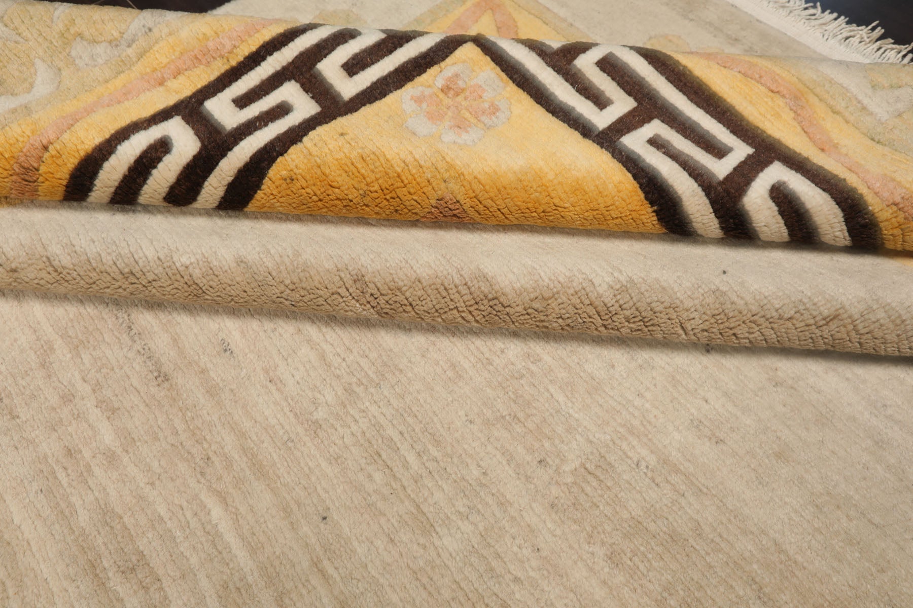 Perfect for interiors that prize structure and elegance, this Tibetan rug from Nepal combines traditional craftsmanship with timeless motifs. The oatmeal field is surrounded by a Greek key border in gold and chocolate, softened by floral details in rose and ivory. Enhanced with a Swiss Wash finish for a subtle sheen, the hand knotted wool pile measures 0.6" and rests on a strong cotton foundation. At once simple and luxurious, it anchors rooms with quiet sophistication.