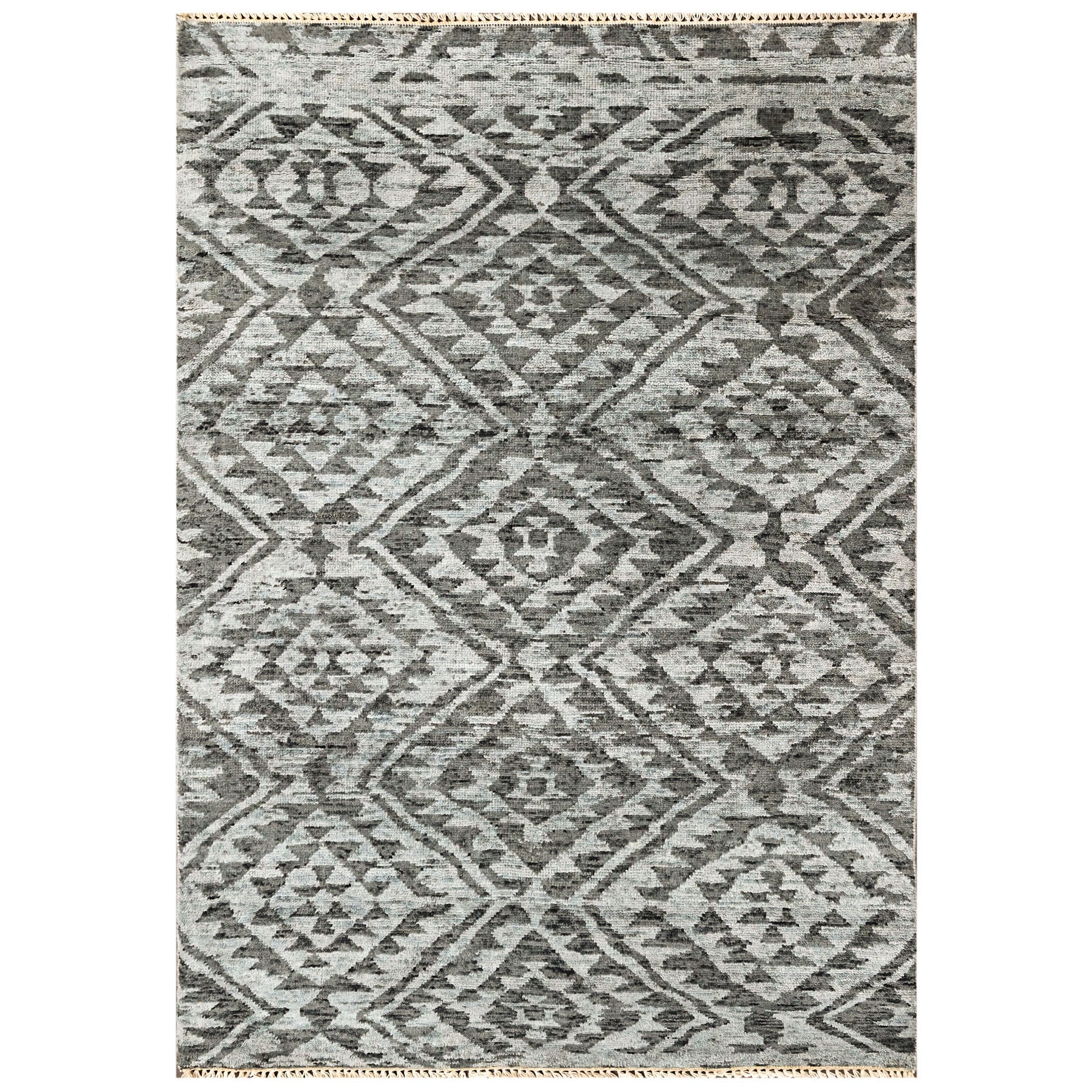 Hand knotted from 100% wool with a cotton foundation, this 4x6 Southwestern rug features a medium pile height and a dark gray palette accented with soft silver tones. Designed to offer both durability and visual structure, this rug brings classic Southwestern patterning into a refined, neutral color story that works effortlessly in a range of interiors. The rug’s surface is defined by a repeating diamond lattice, a traditional Southwestern motif known for its balanced and symmetrical composition. Each diamond is filled with smaller geometric elements that create a sense of rhythm across the rug without appearing busy. Rendered in layered shades of dark gray, charcoal, and muted silver, the pattern reads clearly while remaining understated. The subtle shifts in tone allow the design to feel textured and natural, highlighting the hand-knotted wool construction and giving the rug a composed, well-crafted appearance. Well suited for living rooms, bedrooms, home offices, or entryways, this 4x6 hand knotted wool dark gray Southwestern rug helps anchor furniture arrangements and define smaller spaces. Its restrained palette and structured design make it an excellent choice for modern, industrial, and transitional interiors that value craftsmanship, natural materials, and quietly confident pattern.