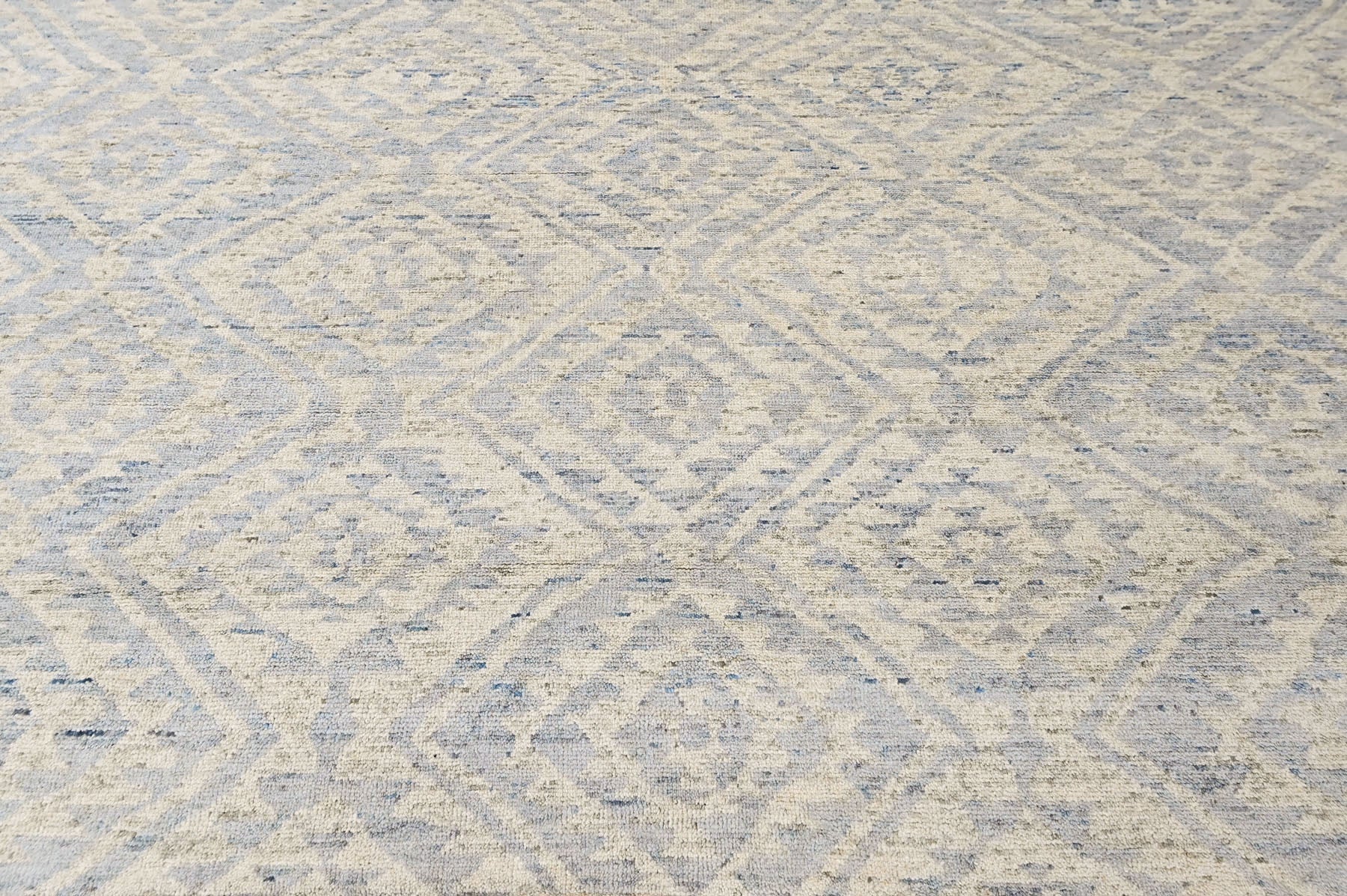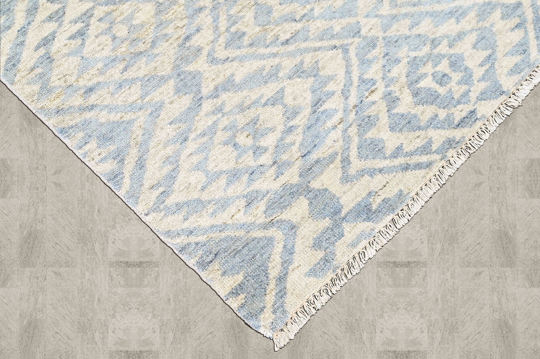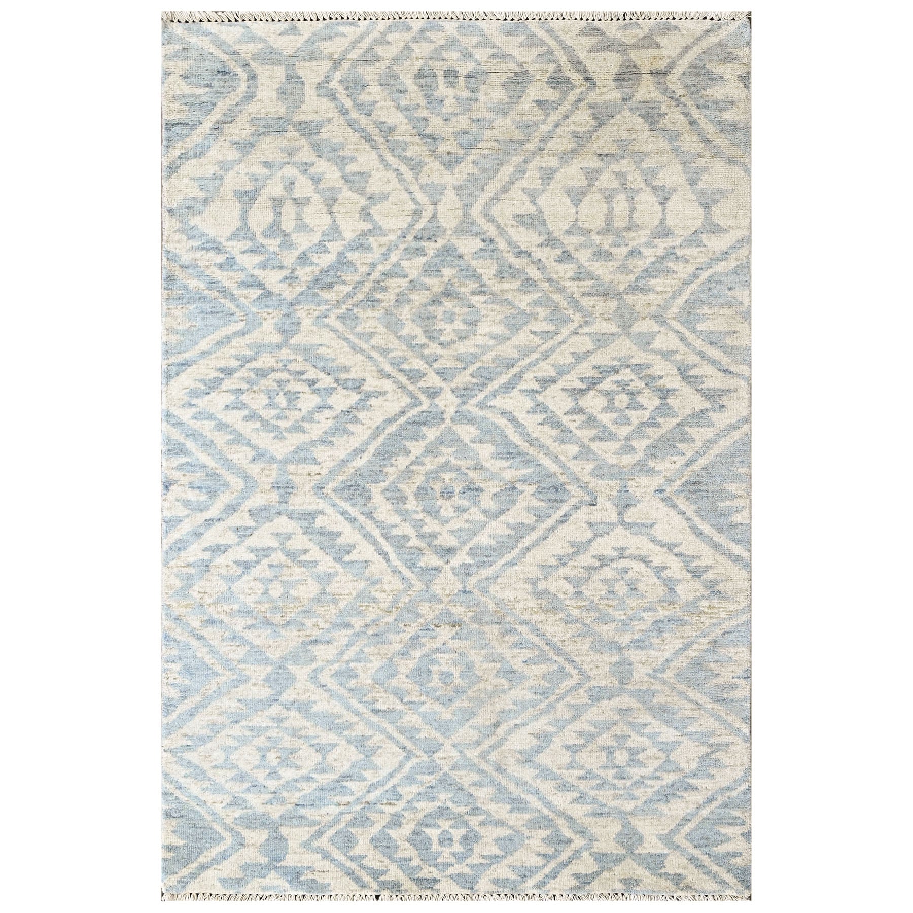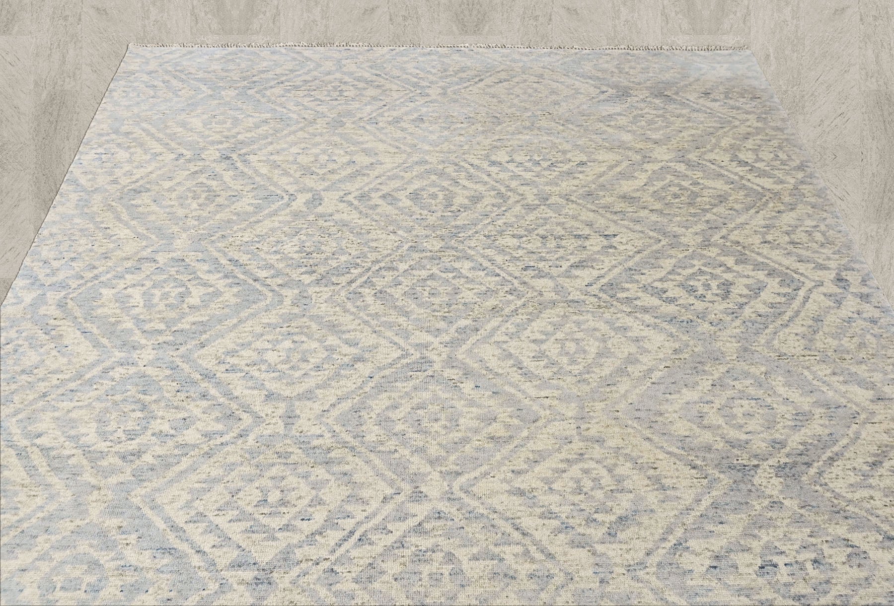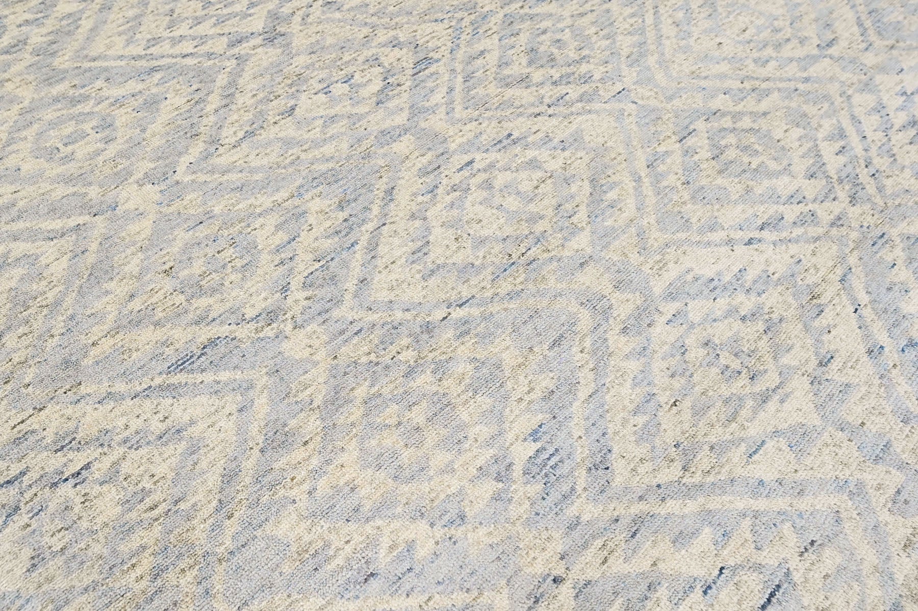 Rooted in the enduring traditions of hand-knotted weaving, this hand knotted wool Southwestern rug reflects a balance between structure, material, and regional design language. The rug’s surface design features layered diamond motifs rendered in muted gray and airy blue tones, creating visual depth without overwhelming the space. Subtle tonal variations within the pattern give the rug a gently weathered, textural quality, while the precise hand-knotted construction ensures clarity in every line and shape. Made from quality wool with a cotton foundation, the rug offers natural durability, a medium pile height, and a tactile finish that feels both substantial and refined. The restrained color story makes this gray and blue Southwestern wool rug especially versatile, pairing easily with both neutral interiors and softly layered color schemes. Ideal for grounding a living room, defining a seating area, or adding warmth to a bedroom or study, this hand knotted wool Southwestern rug in gray and blue works particularly well in any room where texture and craftsmanship can take center stage.