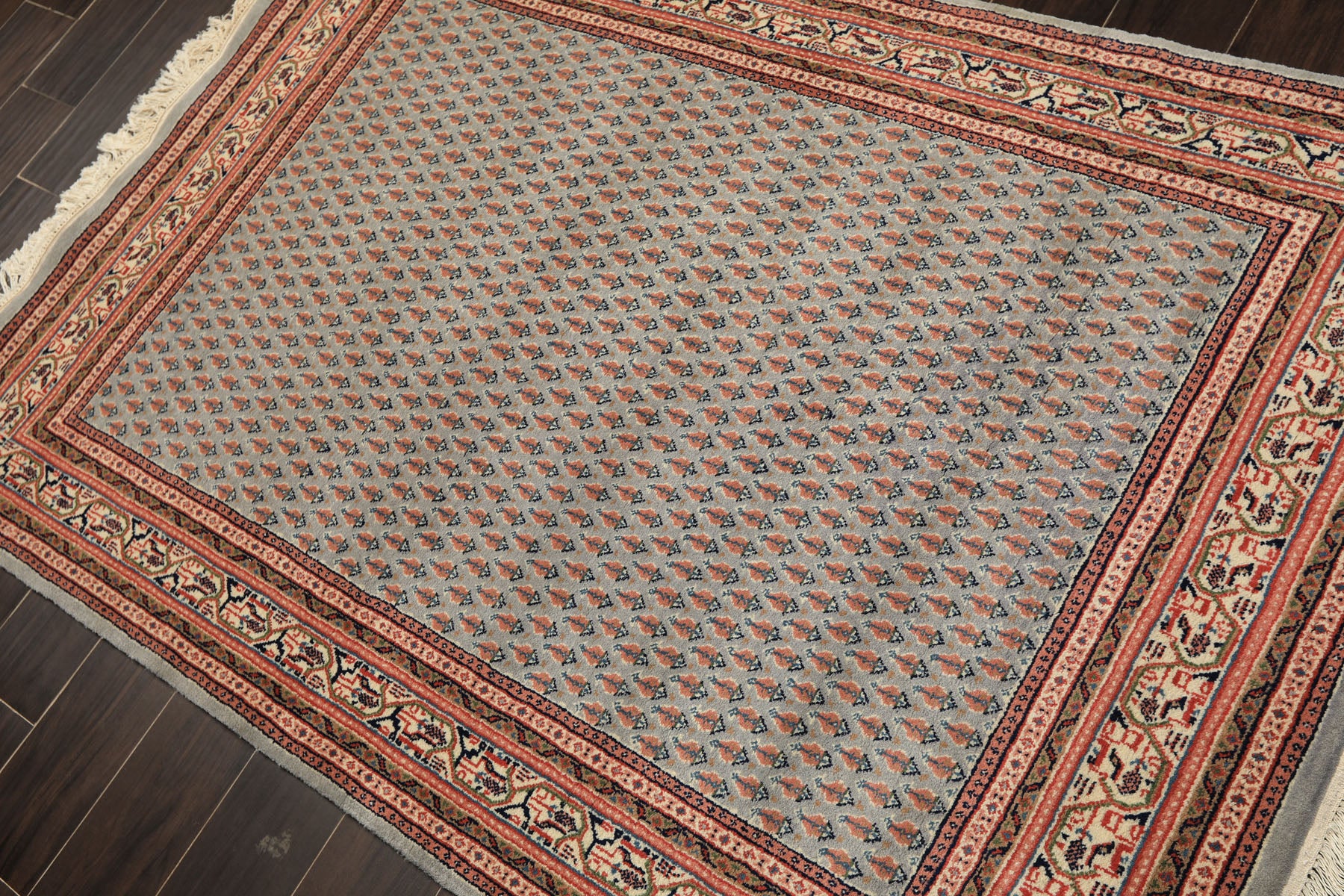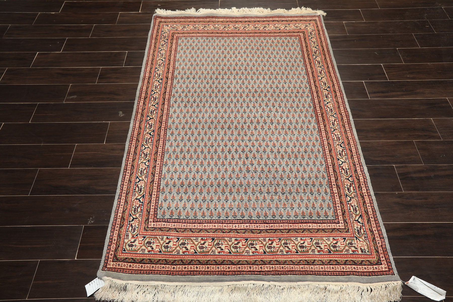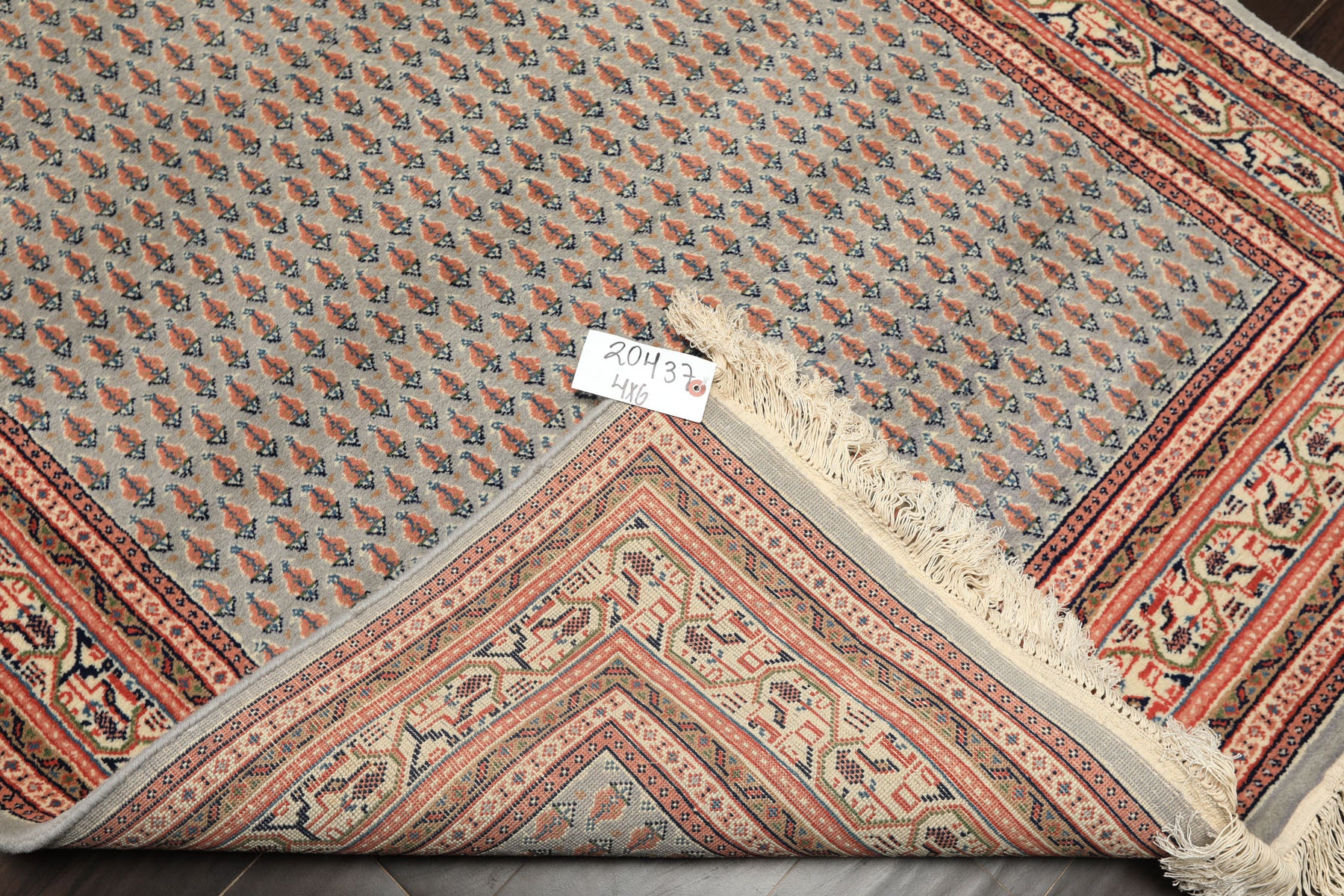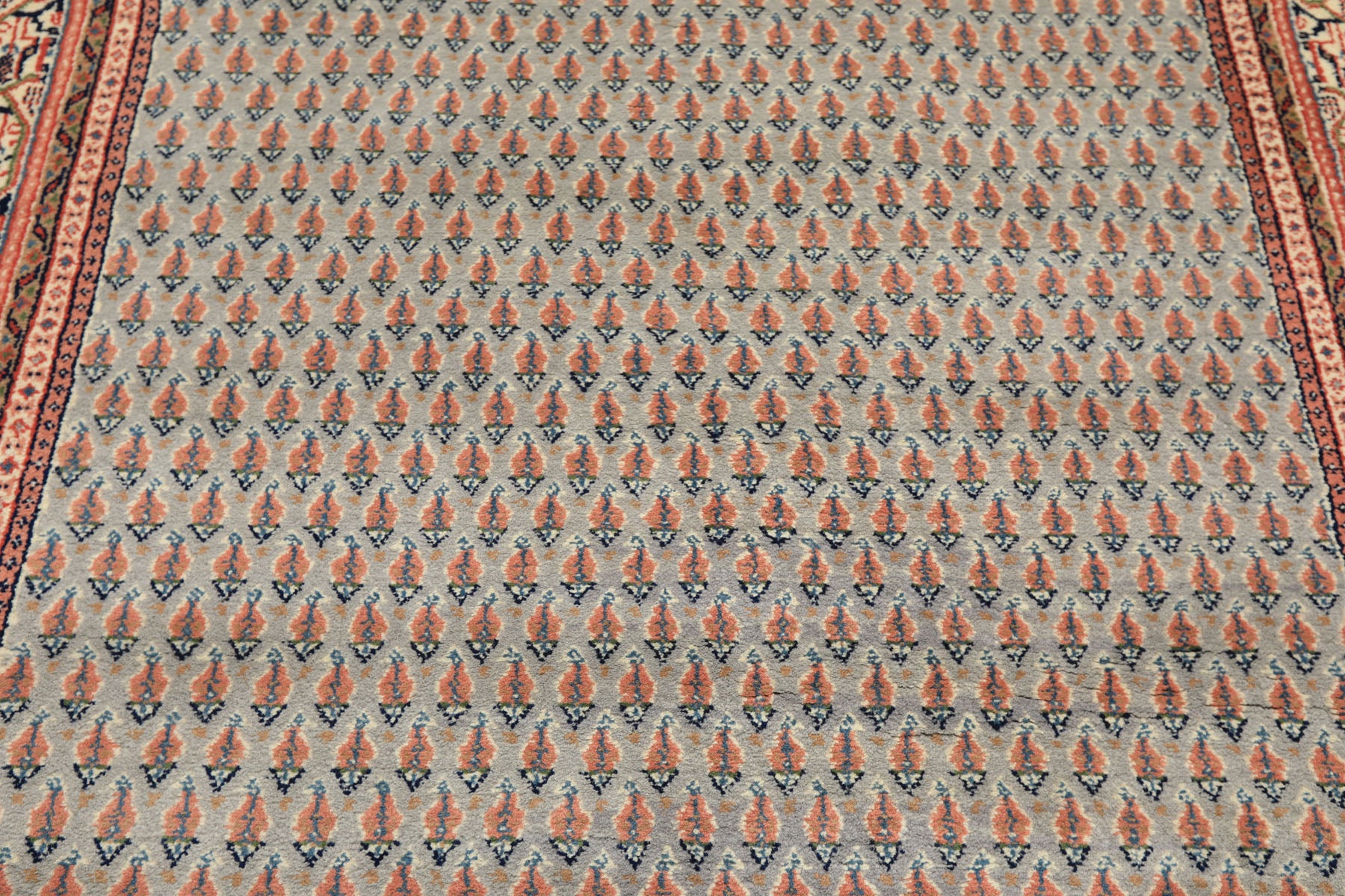 Understated in color yet endlessly detailed in its patterning, this hand-knotted Boteh rug presents one of the most refined allover paisley layouts in the traditional Persian repertoire against a ground that immediately sets it apart from the familiar red and blue field examples of this format. The rug features a cool slate grey field covered edge to edge in a regimented diagonal arrangement of small upright boteh motifs in coral rose and navy, each one a miniature composition in its own right, rendered with the fine detail that only a tightly knotted wool pile can sustain across a field this densely populated. The motifs are organized in precise offset rows that cover the ground completely without a single break or gap, creating an allover texture that reads as a single cohesive surface from a distance while rewarding close inspection with the individual character of each hand-knotted form. The ivory border shifts to a warmer register, presenting a continuous procession of stylized bird and animal figures interspersed with floral devices in rust, navy, and olive green, a frieze that draws directly from ancient Persian decorative traditions and adds a narrative dimension to the border that contrasts beautifully with the strict geometric order of the field. Narrow coral red guards define the boundary between field and border on both sides, their warm tone bridging the cool grey interior and the ivory outer frame with precision. Hand-knotted in wool on a cotton foundation, this is a Boteh rug of genuine distinction.