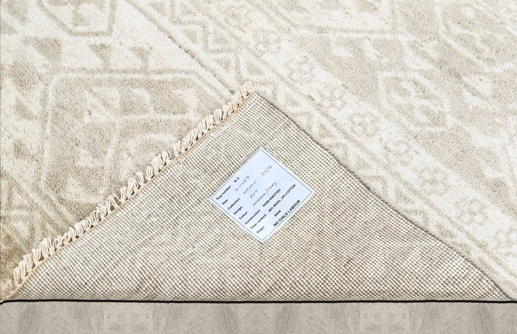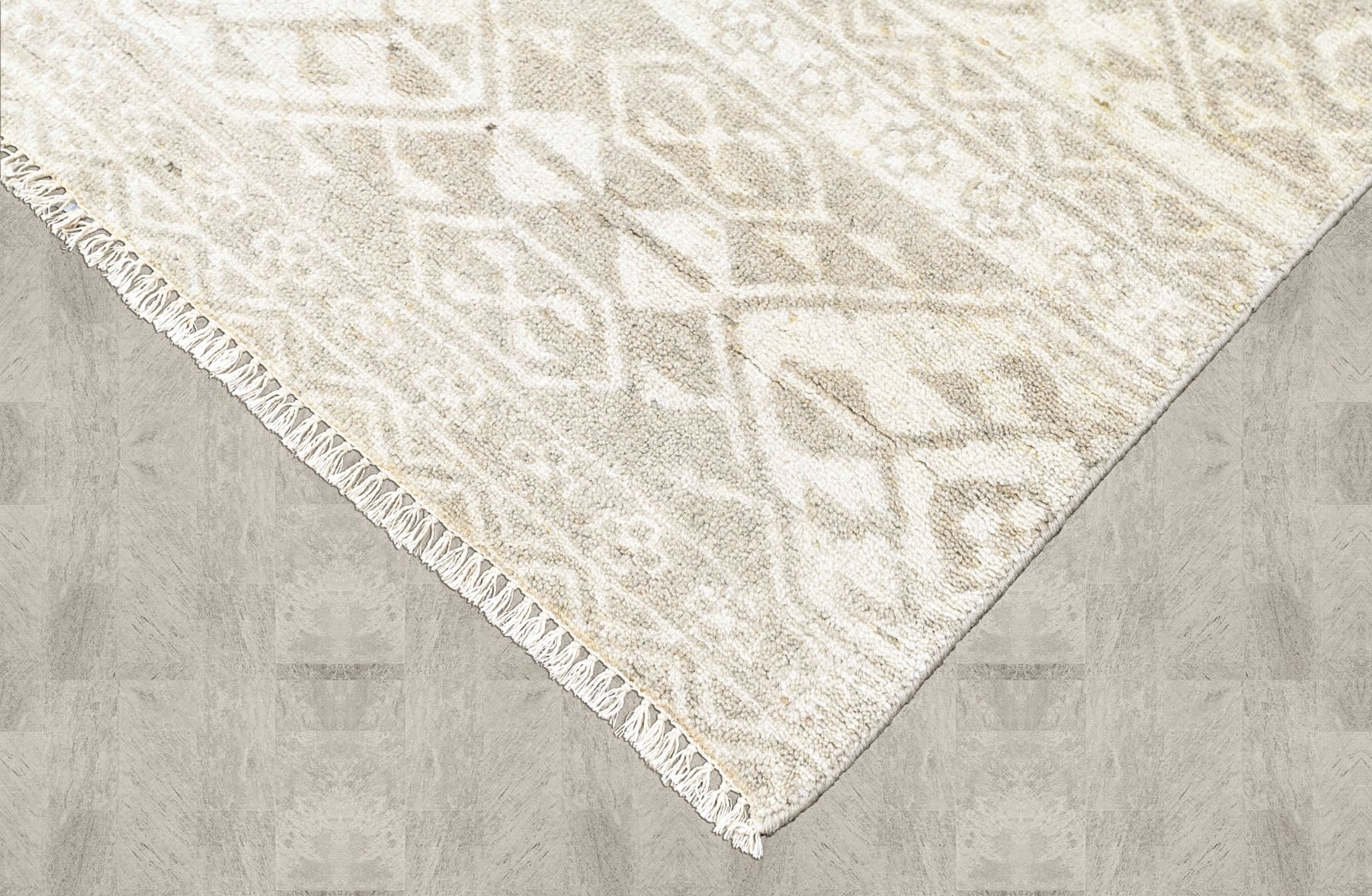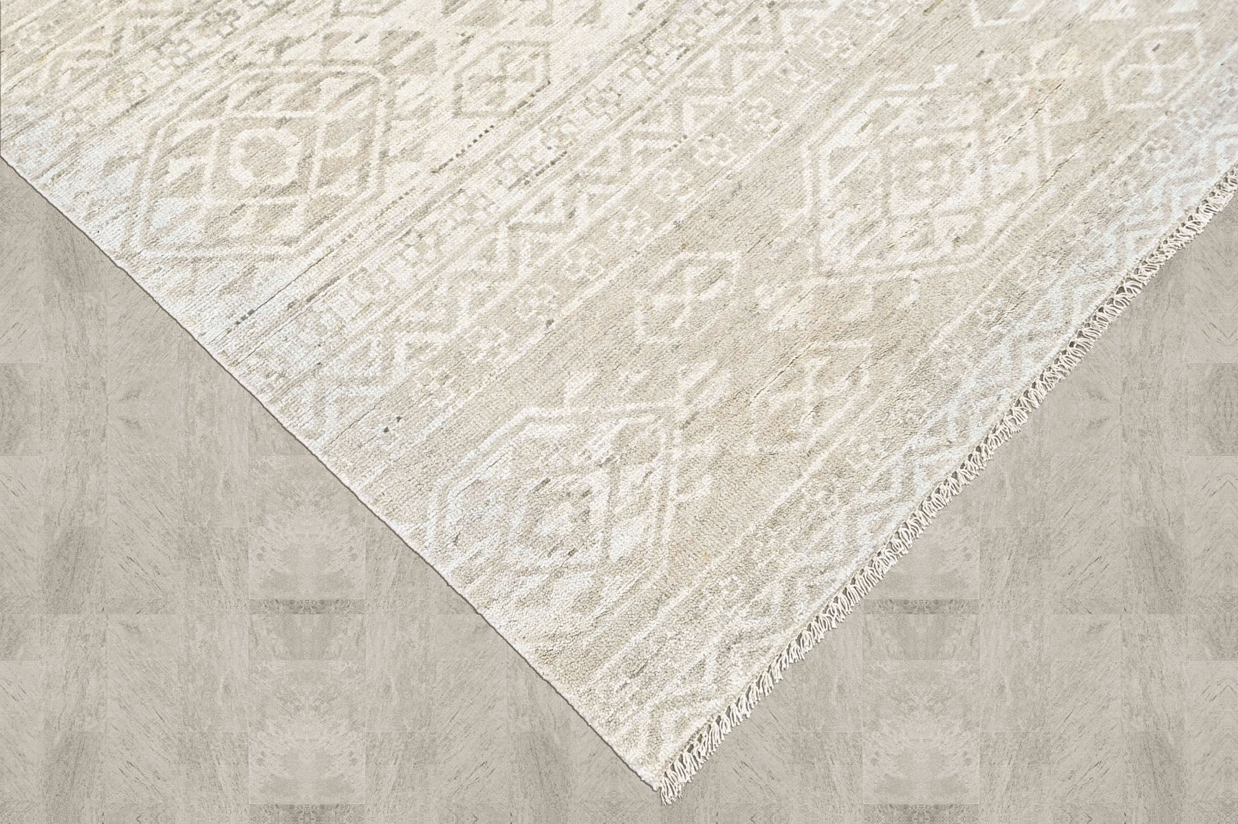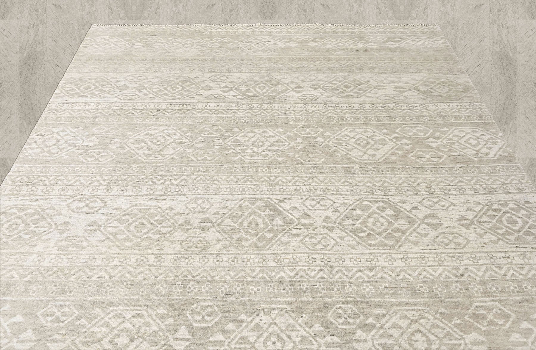 Hand knotted from 100% wool with a cotton foundation, this Southwestern rug features a medium pile height and a refined tone-on-tone gray color palette. Designed to balance visual interest with everyday practicality, this rug presents geometric patterning in a softened, approachable form that feels calm, cohesive, and easy to live with. The rug’s design is composed of horizontal bands filled with traditional motifs, including stylized diamonds, angular lines, and subtle geometric accents. These elements are rendered in closely related shades of light gray, warm stone, and soft silver, creating a layered look that reads as intentional and well-composed rather than decorative. The consistent gray tones allow the pattern to remain visible without dominating the room, making the rug especially appealing for those drawn to texture and craftsmanship over bold color. The hand-knotted wool surface gives the pattern a gently varied, organic finish, while the cotton foundation supports long-term structure and stability. Well suited for living rooms, bedrooms, or quiet sitting areas, this hand knotted wool tone-on-tone gray Southwestern rug has a clearly articulated design which makes it an easy foundation piece for spaces that favor natural materials, neutral tones, and thoughtfully detailed surfaces.