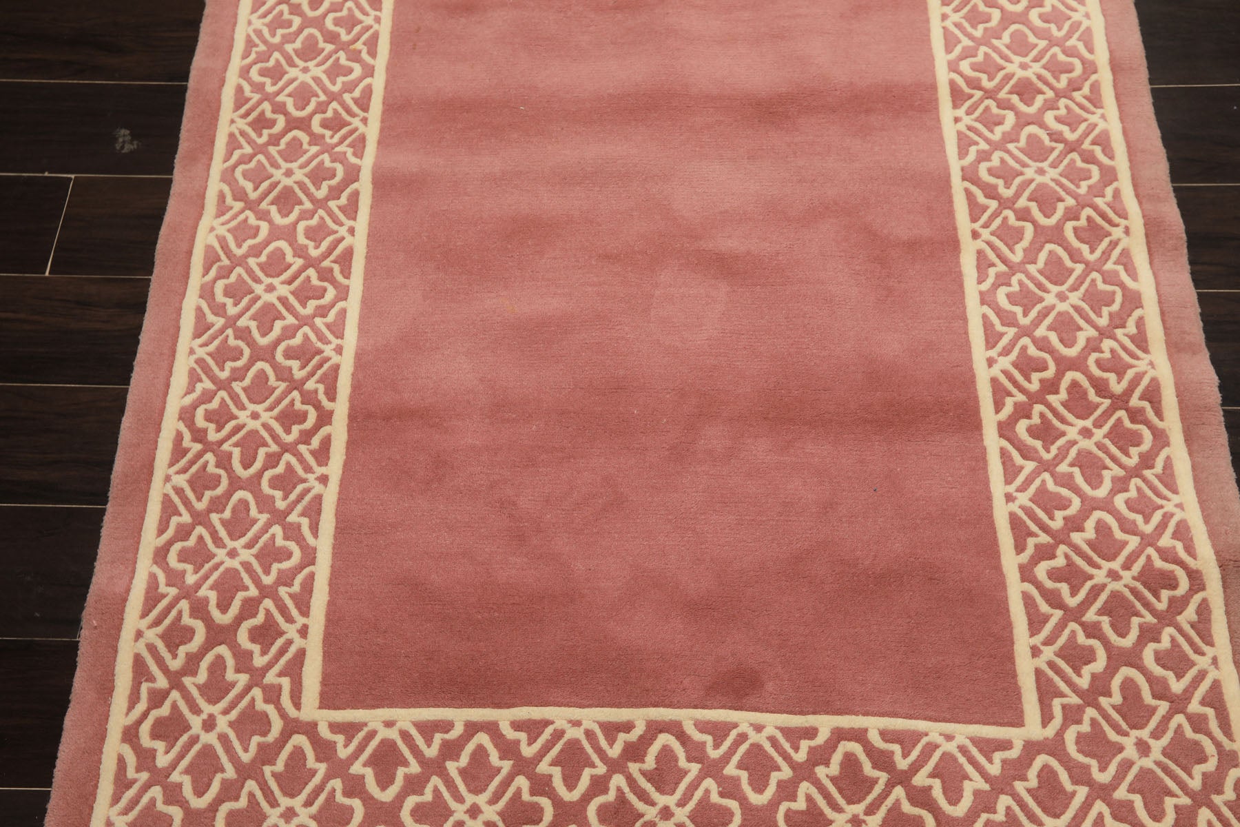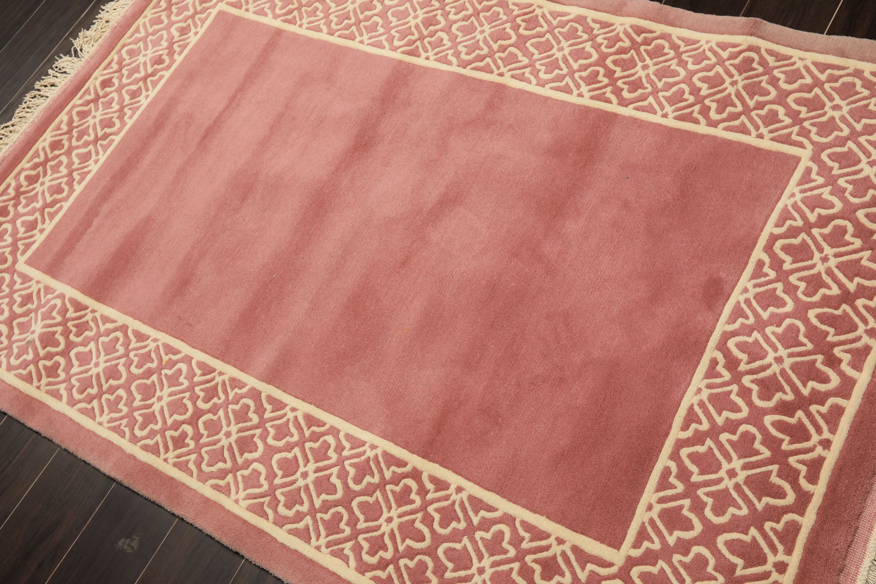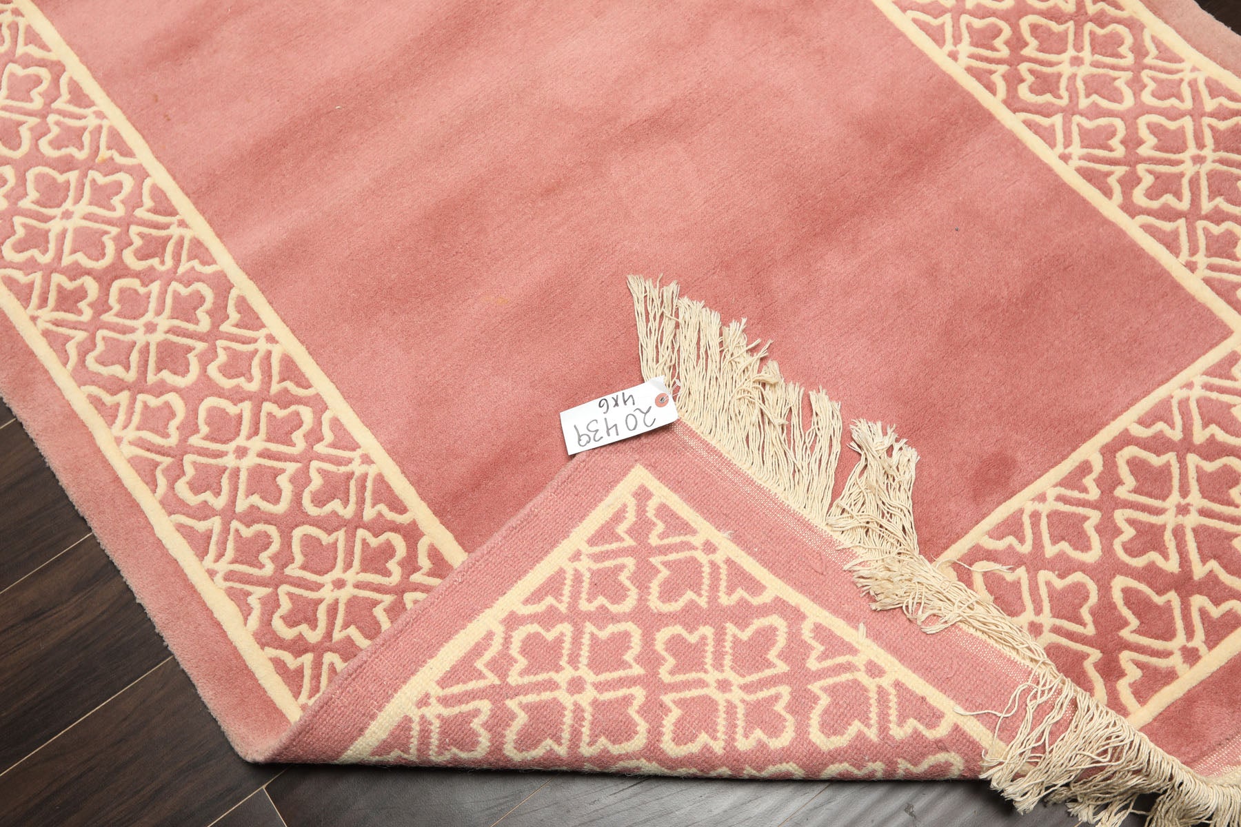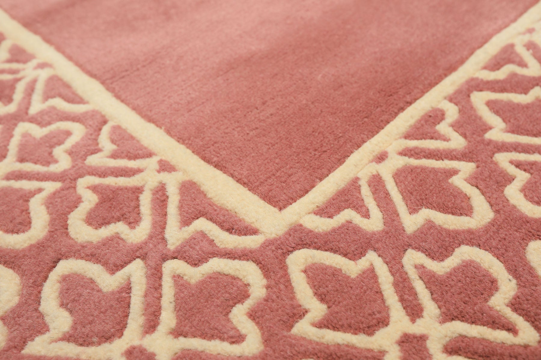 Effortlessly modern, this hand-knotted Indo Tibetan rug builds its entire visual case on the strength of two colors and one well-executed idea. The rug features a broad, open blush rose field left completely unadorned, its soft warm tone carrying a gentle depth and subtle variation across the surface that gives the ground a quiet, lived-in quality. Framing that open field is a wide border of densely interlocking Moroccan-style quatrefoil lattice rendered entirely in ivory against the matching blush ground, the repeat precise and continuous, wrapping all four sides of the rug in a pattern that reads as both geometric and organic at once, its curved interlocking forms suggesting both tile work and floral tracery depending on how the eye chooses to follow it. A clean ivory inner line separates the field from the border with a simple, considered boundary that makes the transition between the two zones deliberate rather than abrupt. The overall palette of blush and ivory is uncommonly soft for a rug in this format, lending the piece a freshness and femininity that sets it apart from the more neutral or jewel-toned examples typically seen in Indo Tibetan production.