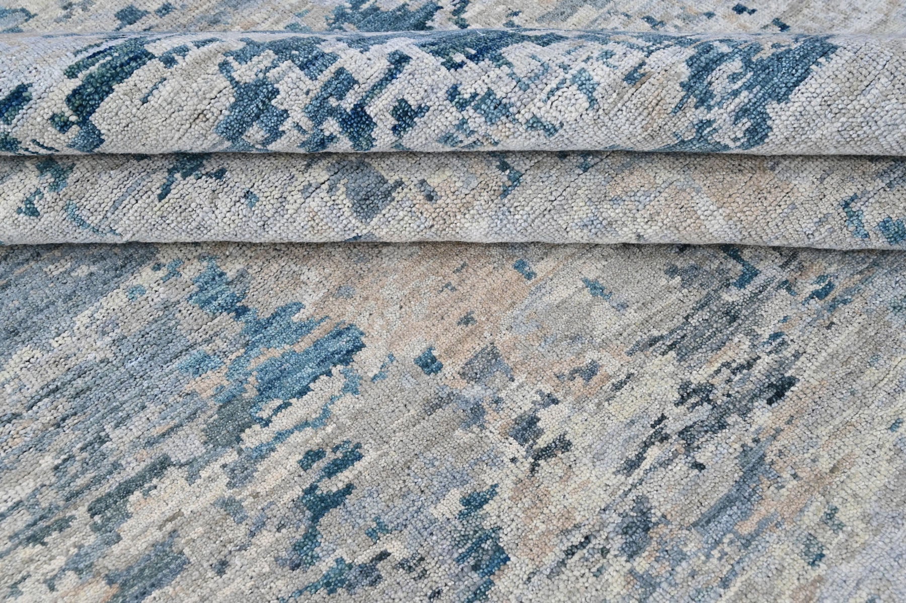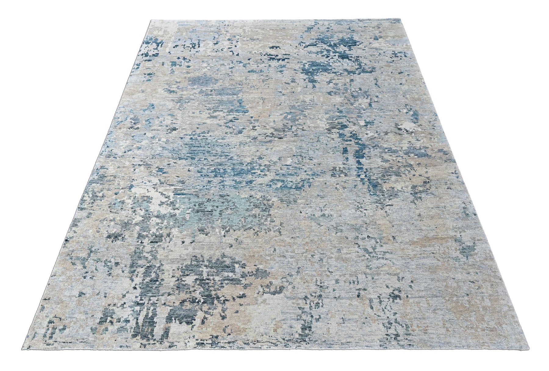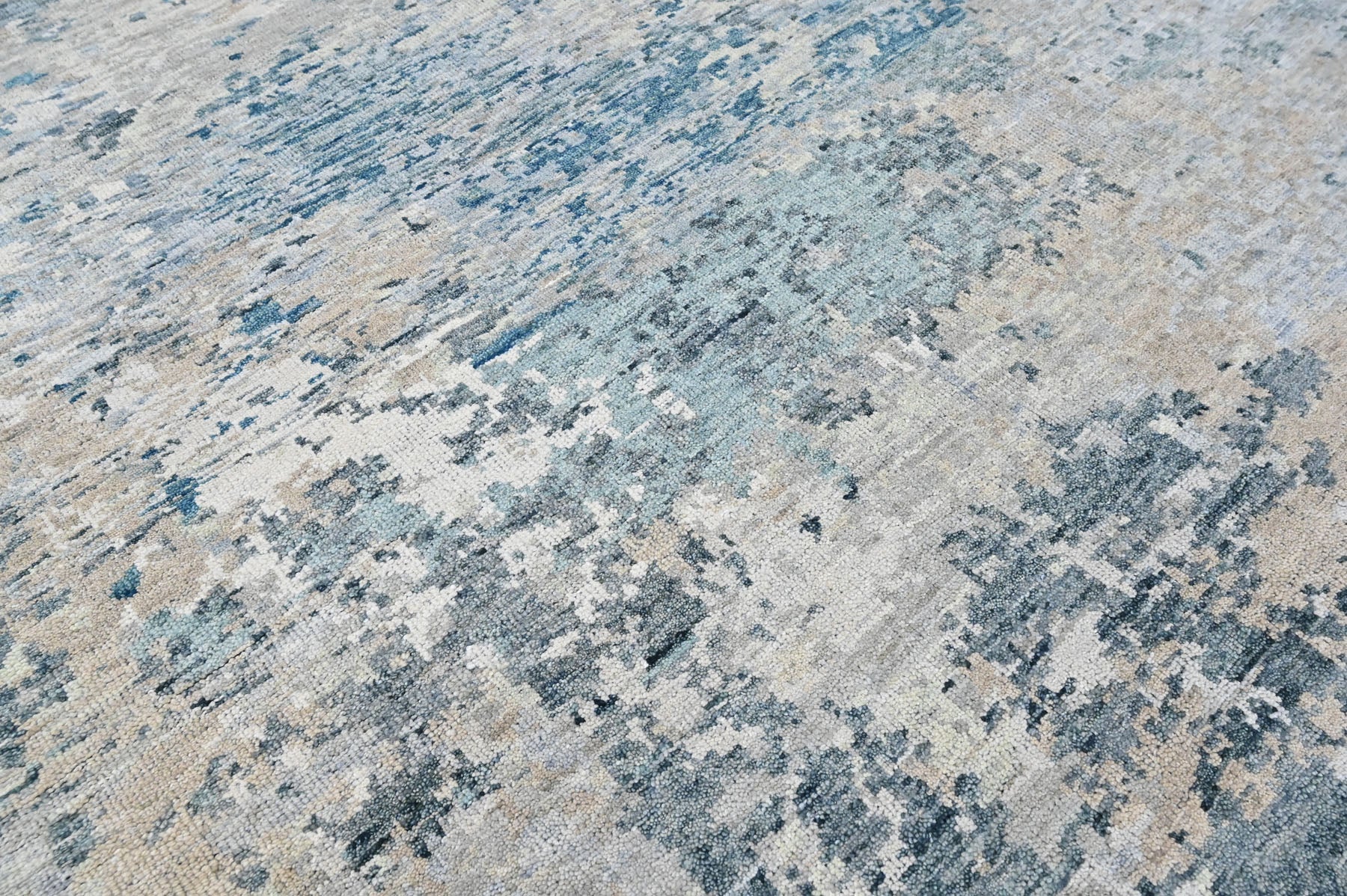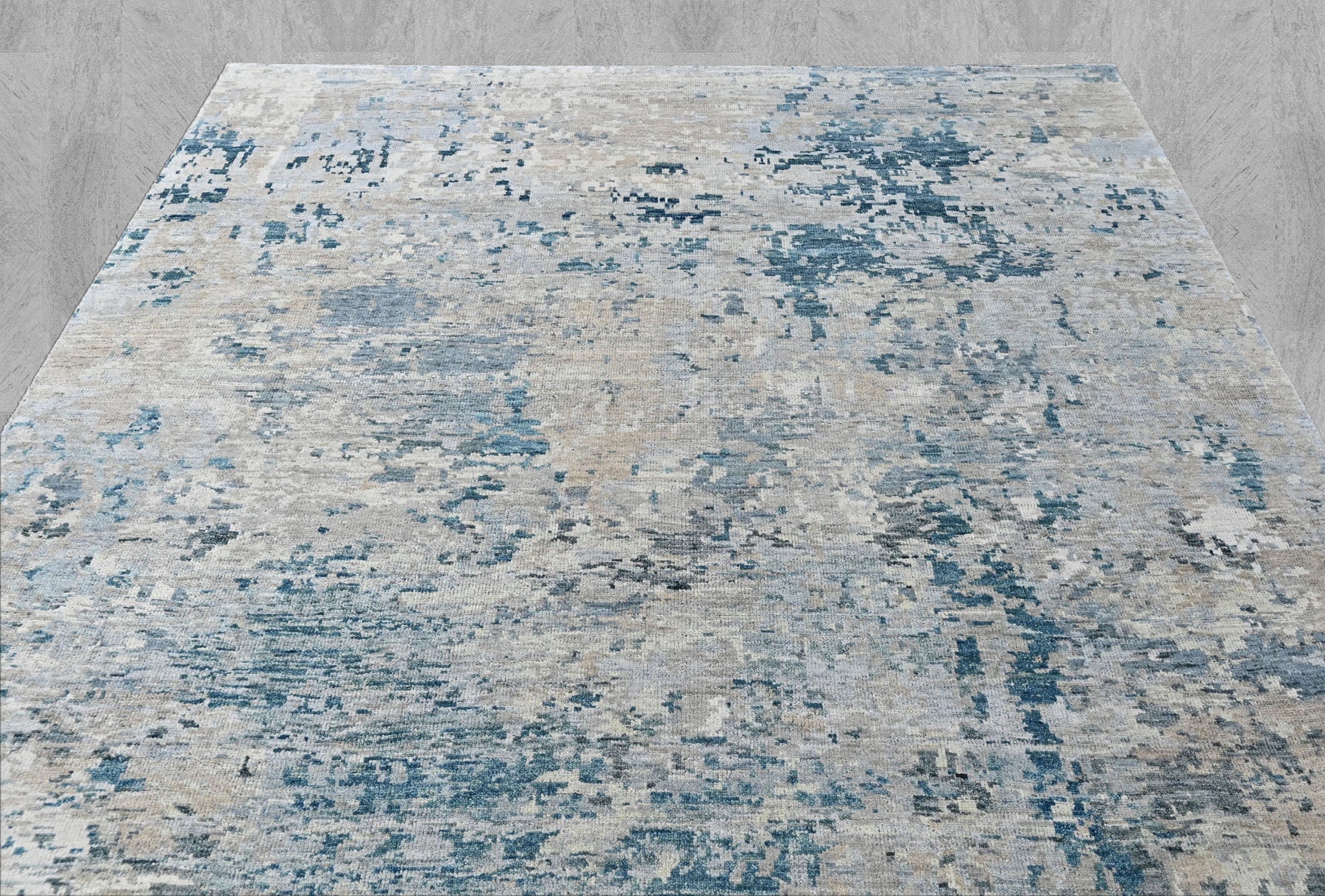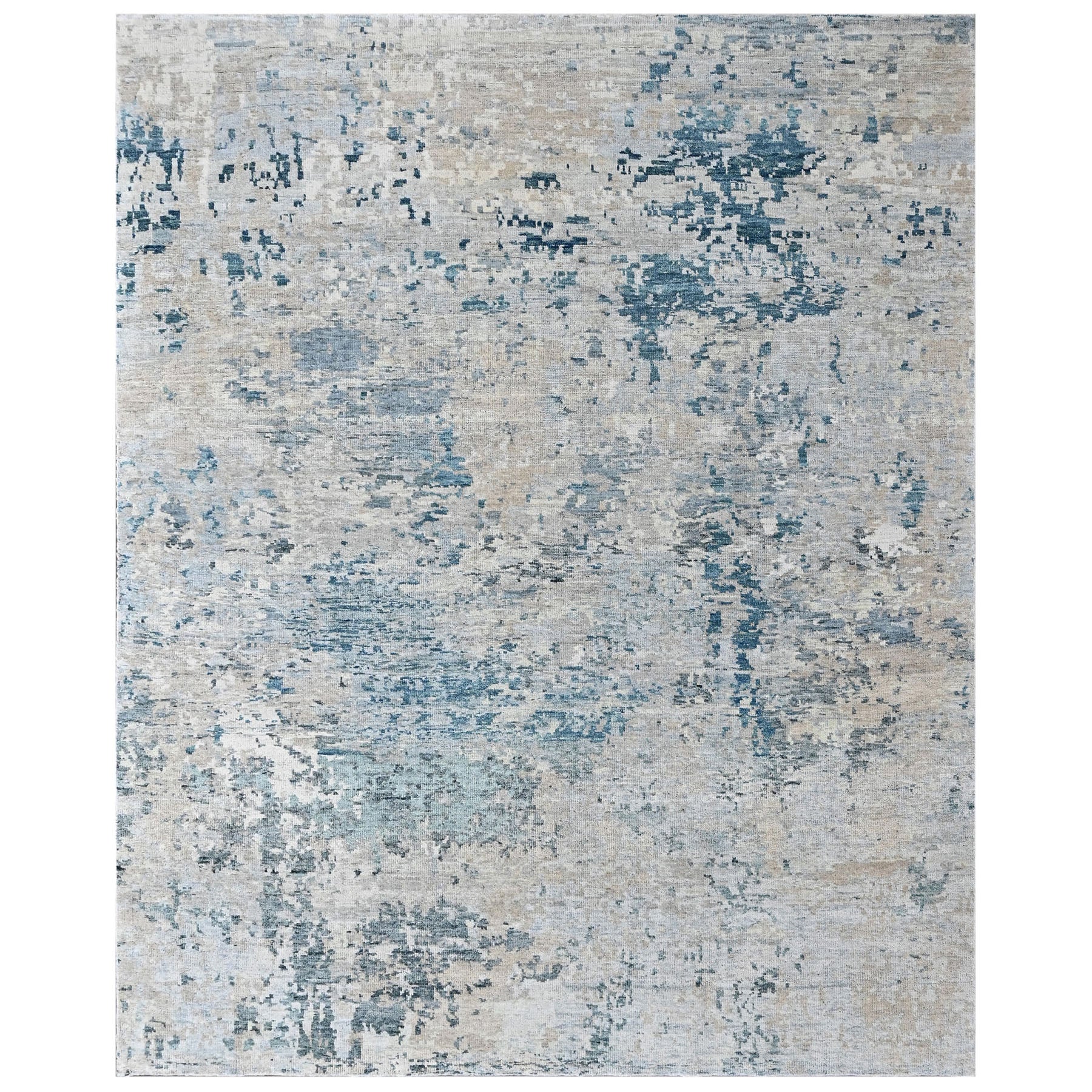 Before you is a hand-knotted Tibetan abstract rug moves away from traditional medallions and borders, focusing instead on texture, tone, and movement. The rug features a layered gray foundation, where multiple shades of soft gray create a calm, stone-like base. Across this surface, irregular washes of blue and slate appear in broken, painterly patches, giving the rug a weathered, almost watercolor effect rather than a defined pattern. These blue tones range from muted steel blue to deeper slate blue, drifting organically across the rug and creating a sense of depth and motion. Subtle beige undertones emerge beneath the gray and blue layers, warming the composition and preventing the palette from feeling cold or flat. The abstract design has no central focal point, allowing the eye to move naturally across the surface. This approach is characteristic of Tibetan-inspired contemporary rugs, where hand-knotting is used to emphasize surface variation and tonal richness rather than symmetry. Crafted in wool on a cotton foundation, the rug has a refined, modern presence that acts as a grounding element and adds quiet complexity to the room through color and texture.