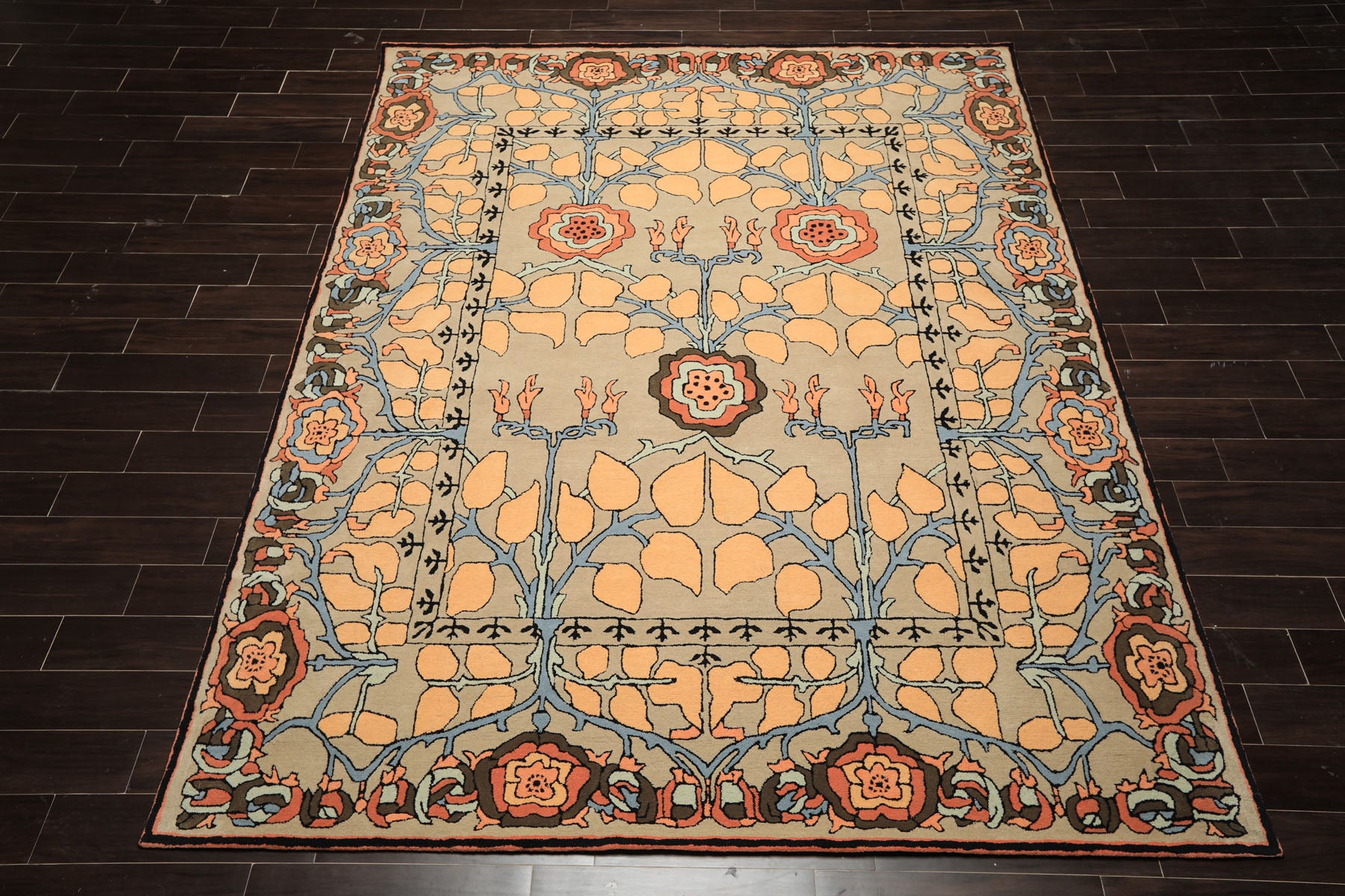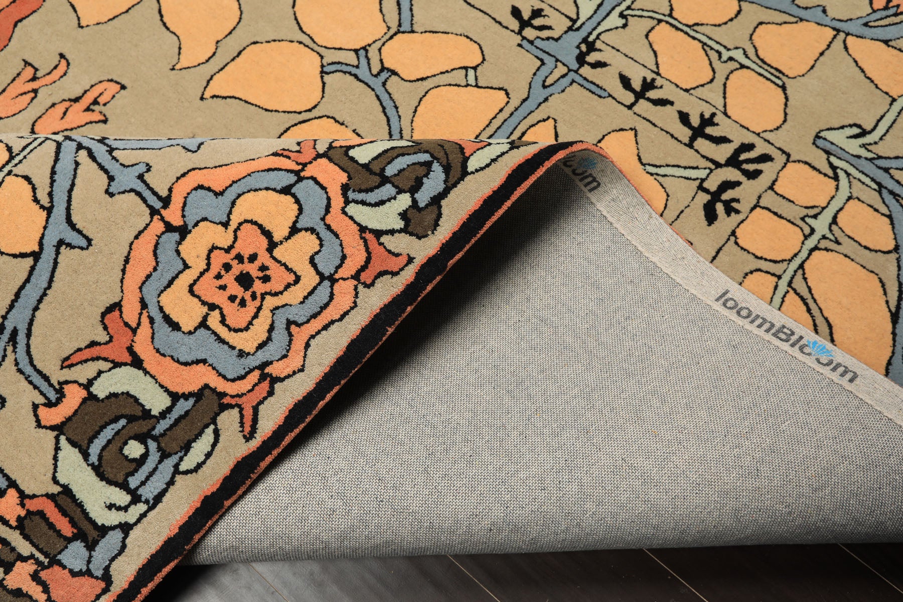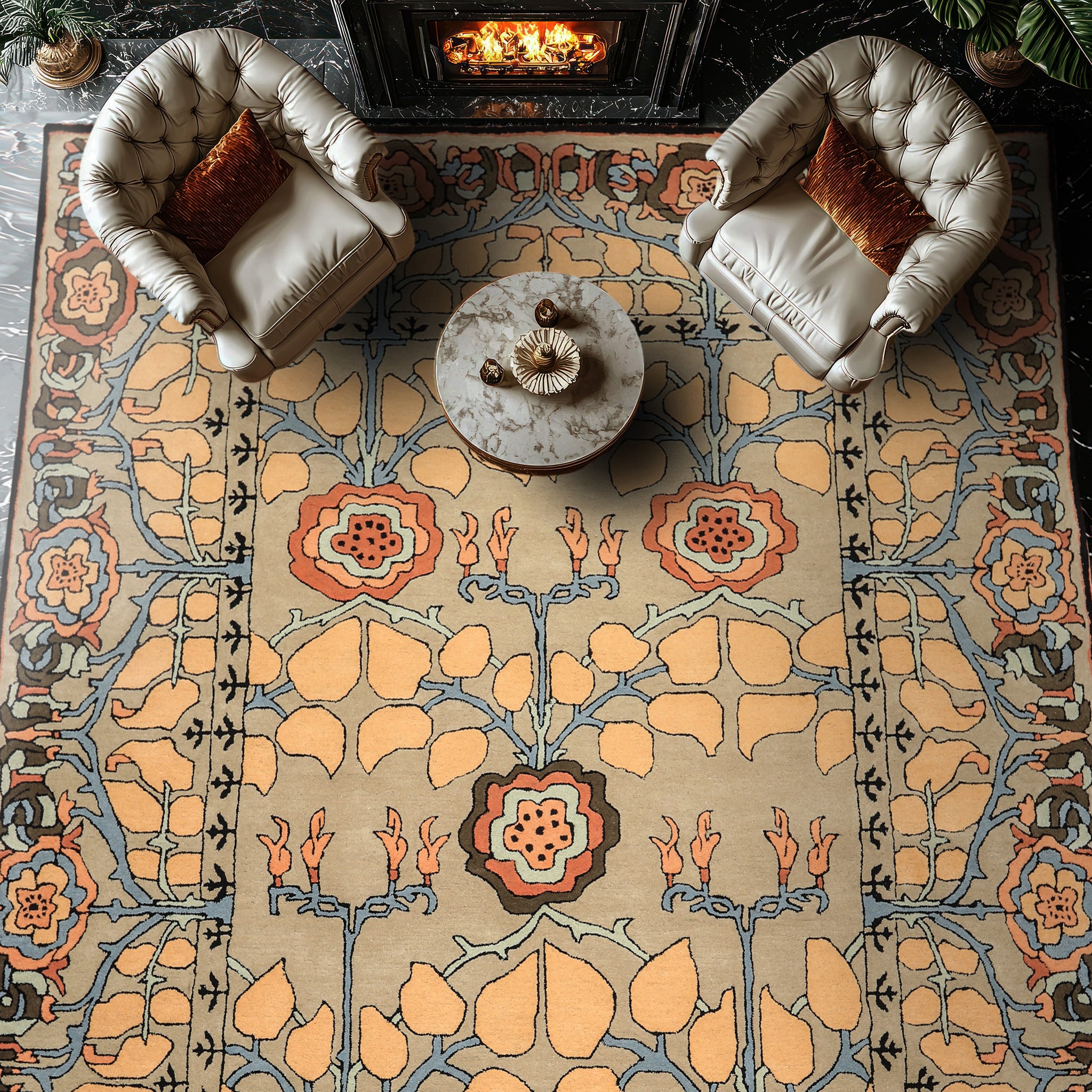 Rooted in the Arts & Crafts movement, this 5x8 hand tufted wool rug translates architectural botanical motifs into a refined, transitional floor covering. Woven in a plush cut pile, the rug features a stained-glass–inspired design with structured florals and vinework, offering clarity, symmetry, and visual rhythm. A composed palette of beige, peach, blue, rose, aqua, brown, and black creates warmth while maintaining contrast and definition. Crafted with a durable cotton backing, it balances softness underfoot with everyday practicality. Ideal for living rooms, dining areas, or studies, this rug pairs beautifully with classic wood furniture, mission-style interiors, or transitional spaces that benefit from heritage-inspired design with a polished, timeless finish.