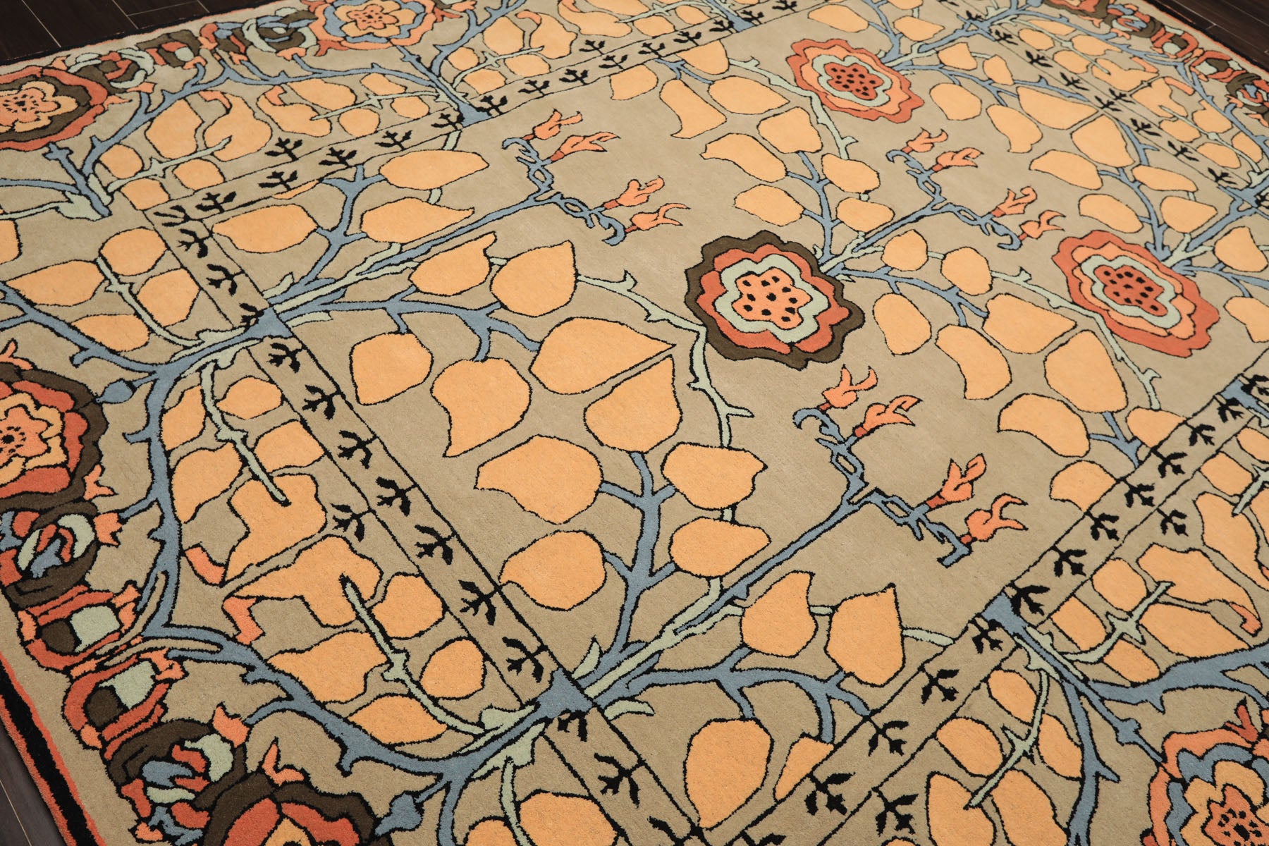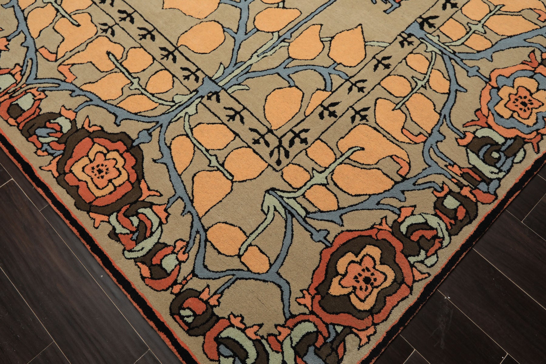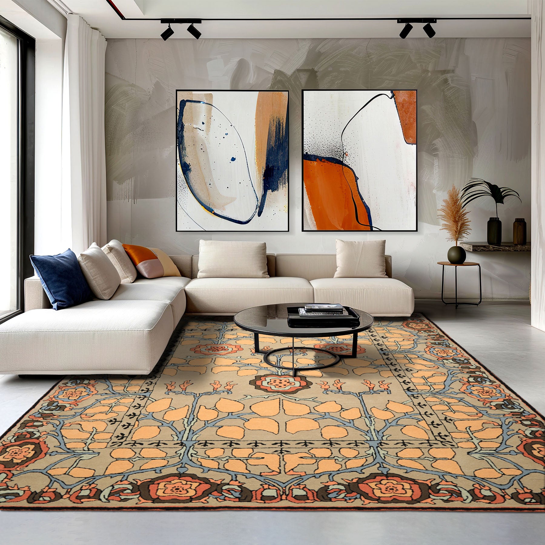 Rooted in the Arts & Crafts movement, this 5x8 hand tufted wool rug translates architectural botanical motifs into a refined, transitional floor covering. Woven in a plush cut pile, the rug features a stained-glass–inspired design with structured florals and vinework, offering clarity, symmetry, and visual rhythm. A composed palette of beige, peach, blue, rose, aqua, brown, and black creates warmth while maintaining contrast and definition. Crafted with a durable cotton backing, it balances softness underfoot with everyday practicality. Ideal for living rooms, dining areas, or studies, this rug pairs beautifully with classic wood furniture, mission-style interiors, or transitional spaces that benefit from heritage-inspired design with a polished, timeless finish.