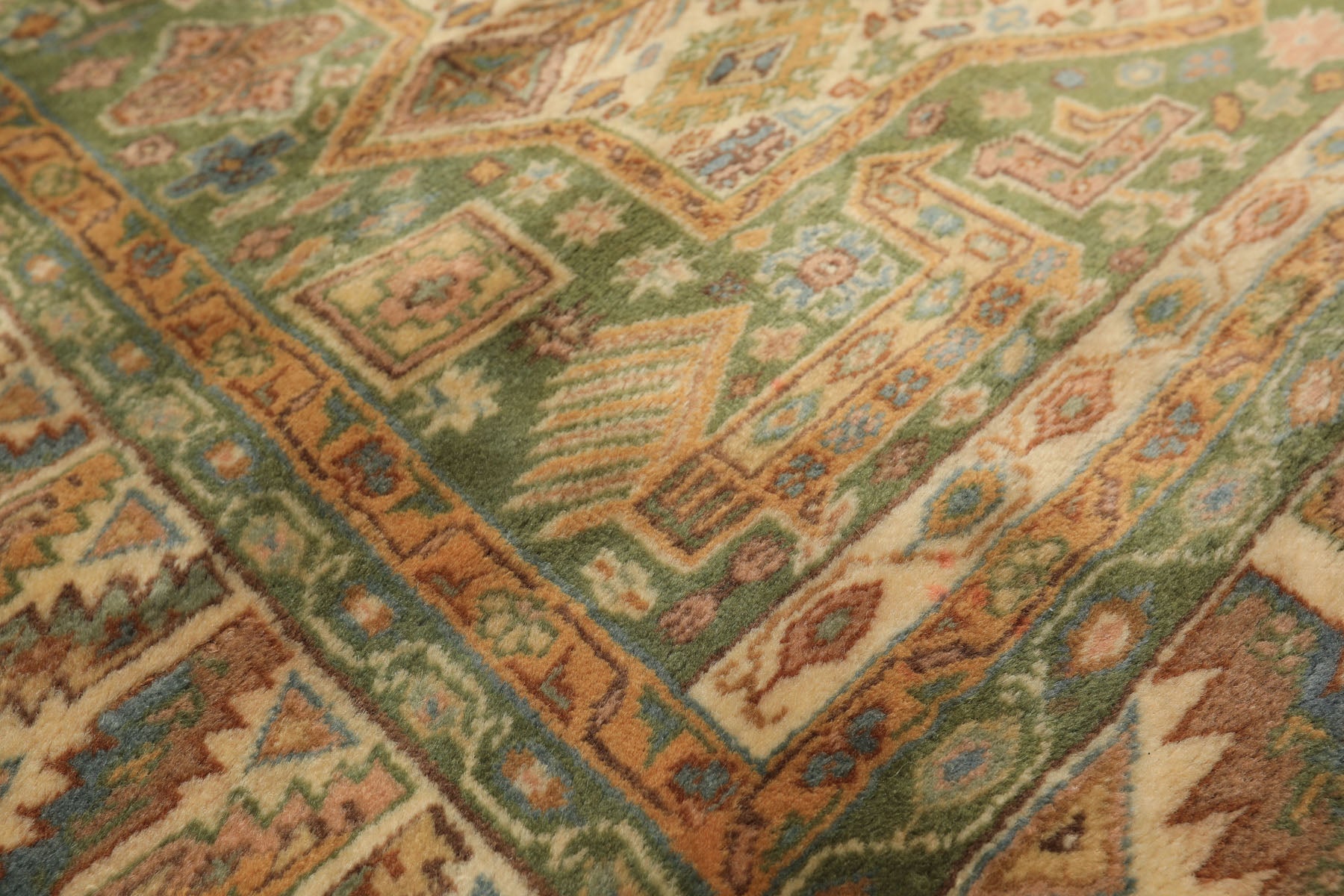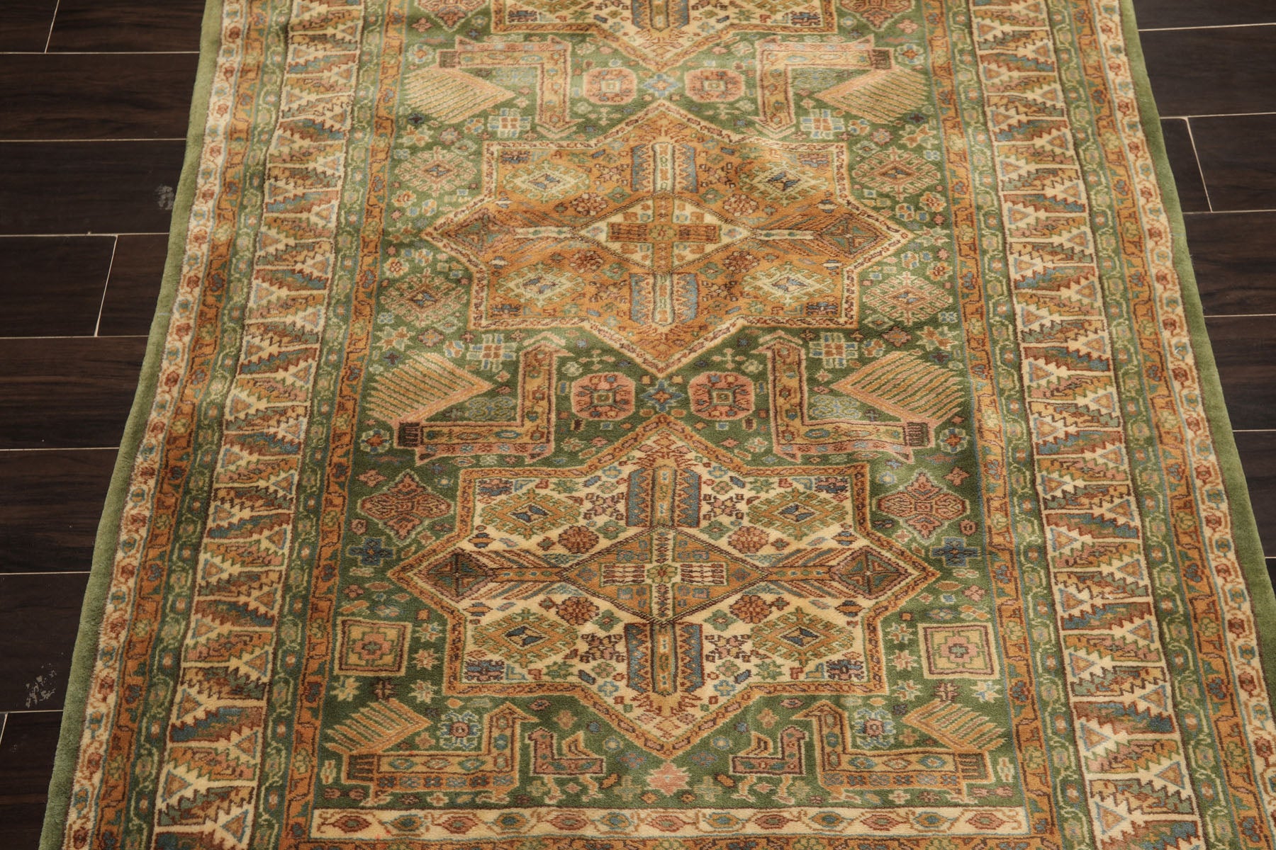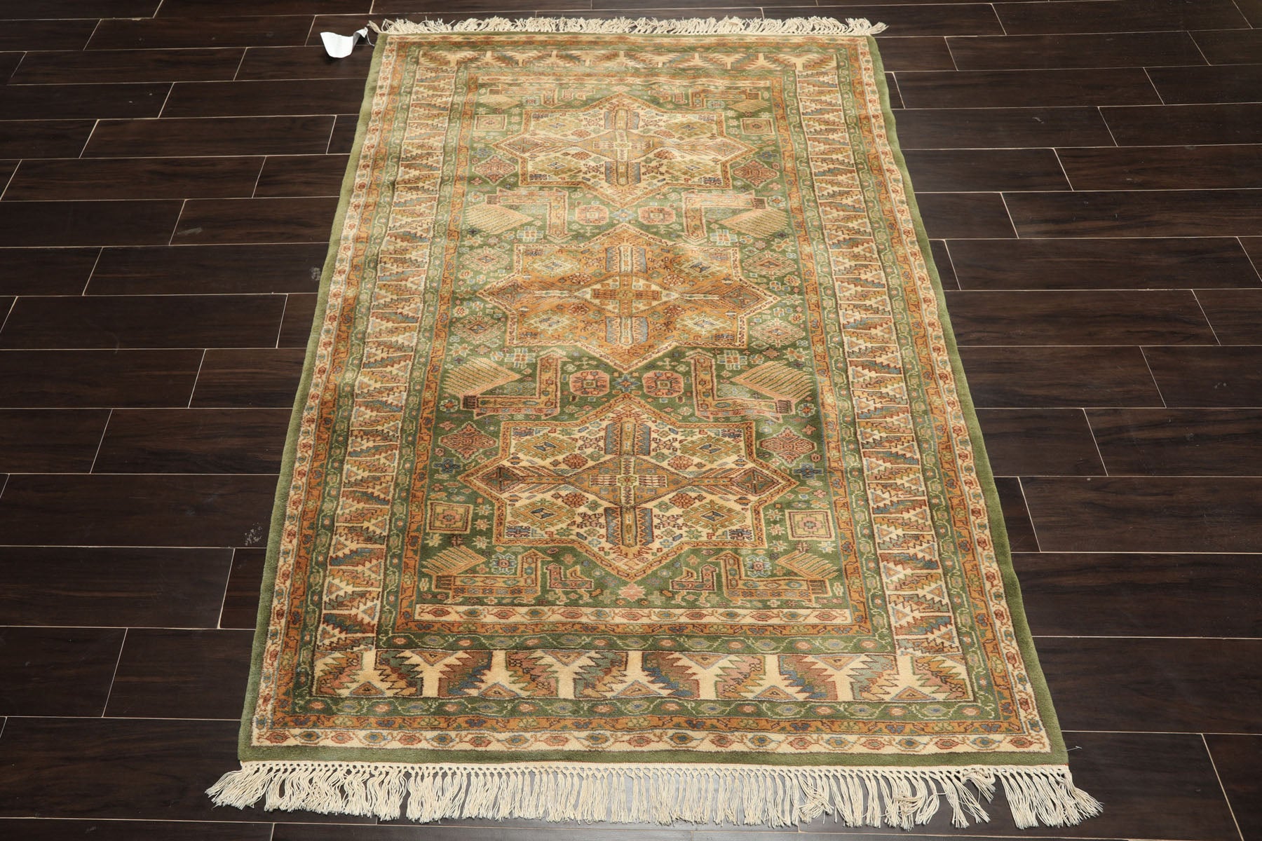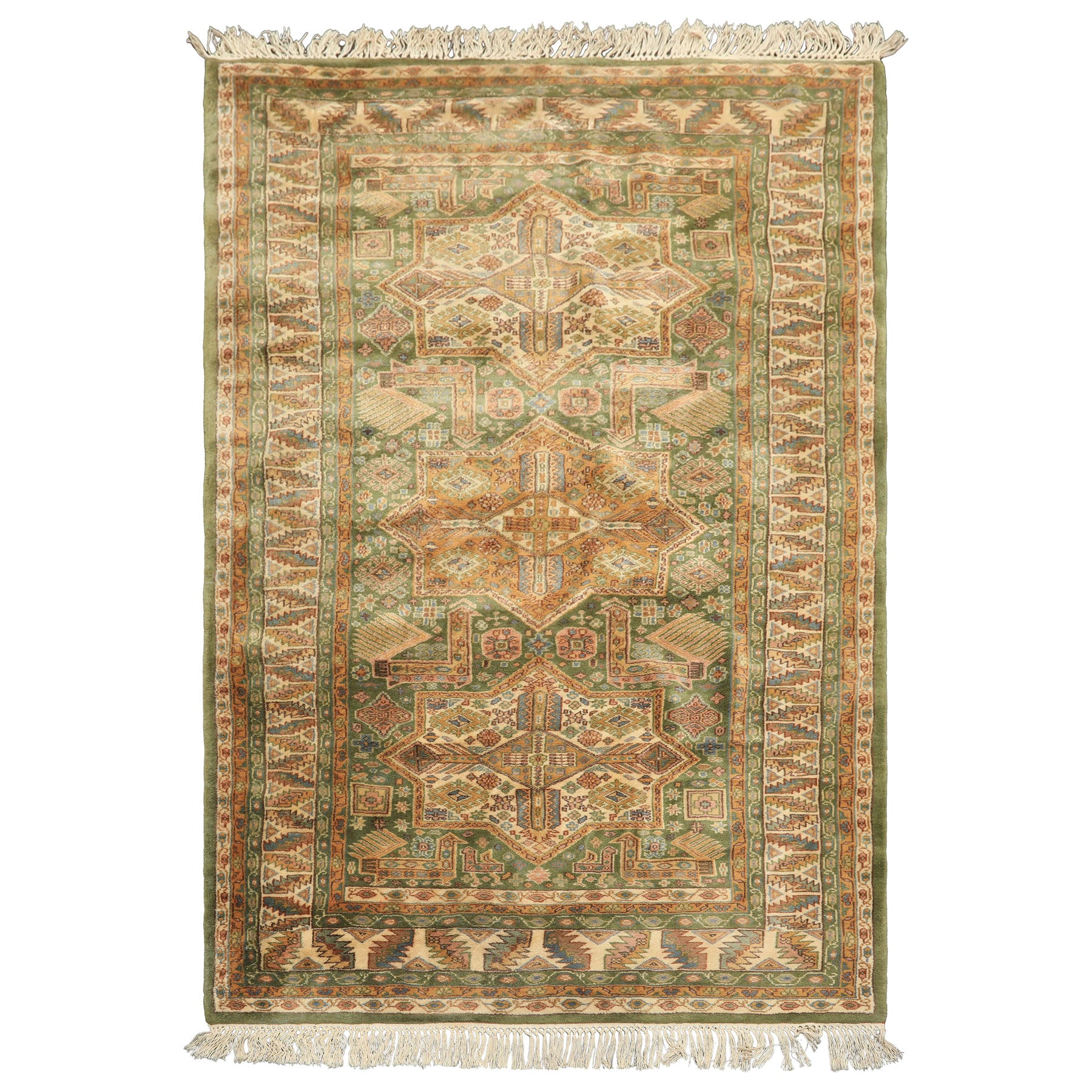 Woven at an impressive 250 knots per square inch, this hand-knotted Kazak rug represents the geometric tribal tradition at its most technically accomplished, delivering both visual complexity and a velvet-soft silky sheen that elevates it well beyond standard pile construction. The rug features a deep sage green field anchored by a vertical series of large star medallions in warm amber gold and ivory, each one built from interlocking hexagonal and diamond forms with stepped angular edges that are the hallmark of classic Kazak draftsmanship. The medallions are not simply decorative objects placed on the field but active, layered compositions in their own right, their interiors filled with smaller geometric devices, cross forms, and rosettes in rust, blue, and rose that reveal increasing levels of detail the closer one looks. Between and around the medallions, the sage green ground carries scattered tribal motifs that maintain movement and energy across the open areas of the field without disrupting the dominance of the central layout. The ivory border presents a bold zigzag and stepped device pattern in green, gold, and rust, its wide format giving the frame considerable visual presence, while a lower register of stylized tree forms in ivory and blue adds an almost narrative quality to the bottom border band.